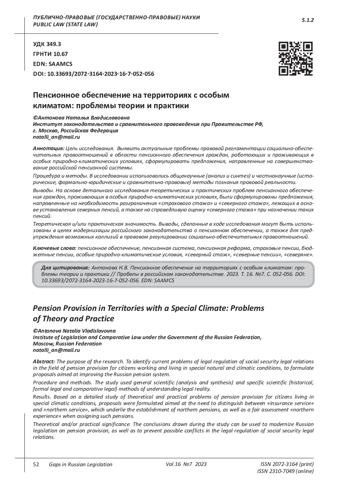Цель исследования. Выявить актуальные проблемы правовой регламентации социально-обеспечительных правоотношений в области пенсионного обеспечения граждан, работающих и проживающих в особых природно-климатических условиях, сформулировать предложения, направленные на совершенствование российской пенсионной системы. Процедура и методы. В исследовании использовались общенаучные (анализ и синтез) и частнонаучные (исторические, формально-юридические и сравнительно-правовые) методы познания правовой реальности. Выводы. На основе детального исследования теоретических и практических проблем пенсионного обеспечения граждан, проживающих в особых природно-климатических условиях, были сформулированы предложения, направленные на необходимость разграничения «страхового стажа» и «северного стажа», лежащих в основе установления северных пенсий, а также на справедливую оценку «северного стажа» при назначении таких пенсий. Теоретическая и/или практическая значимость. Выводы, сделанные в ходе исследования могут быть использованы в целях модернизации российского законодательства о пенсионном обеспечении, а также для предупреждения возможных коллизий в правовом регулировании социально-обеспечительных правоотношений.