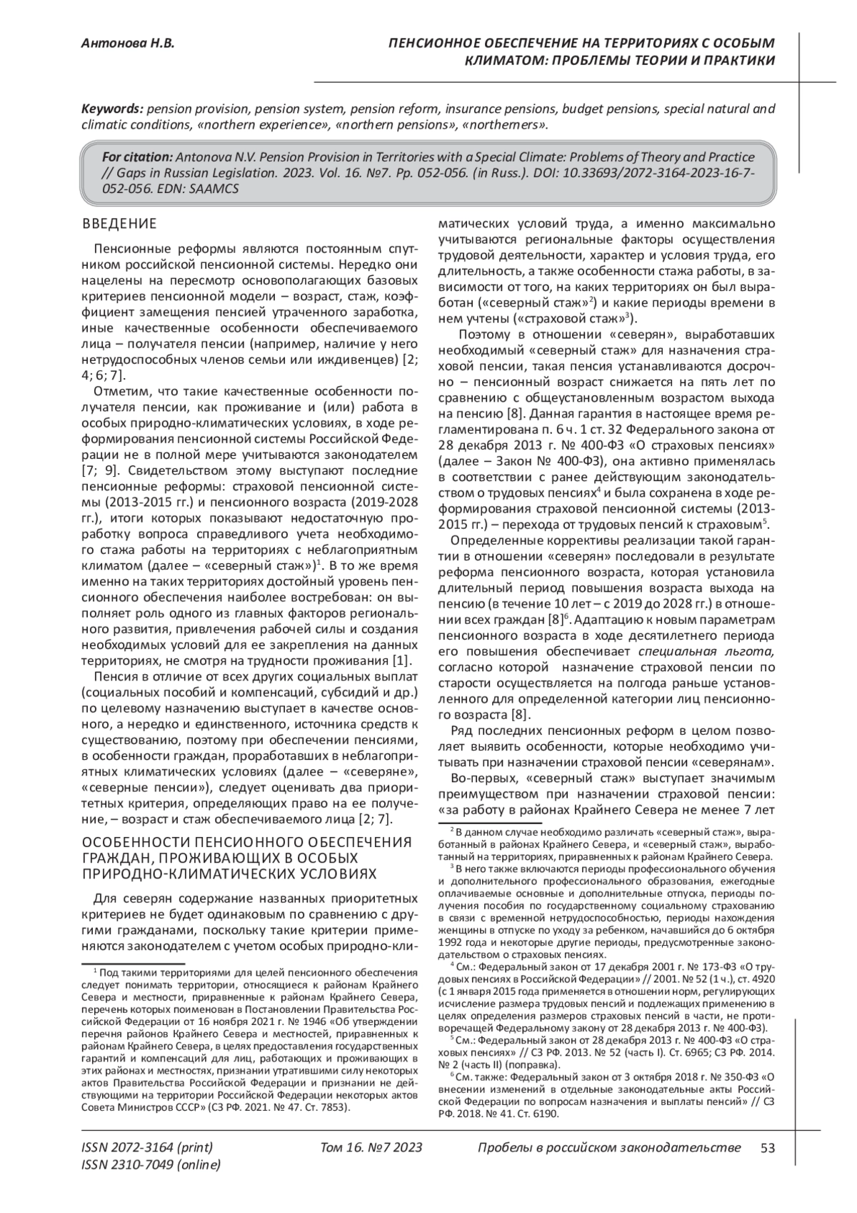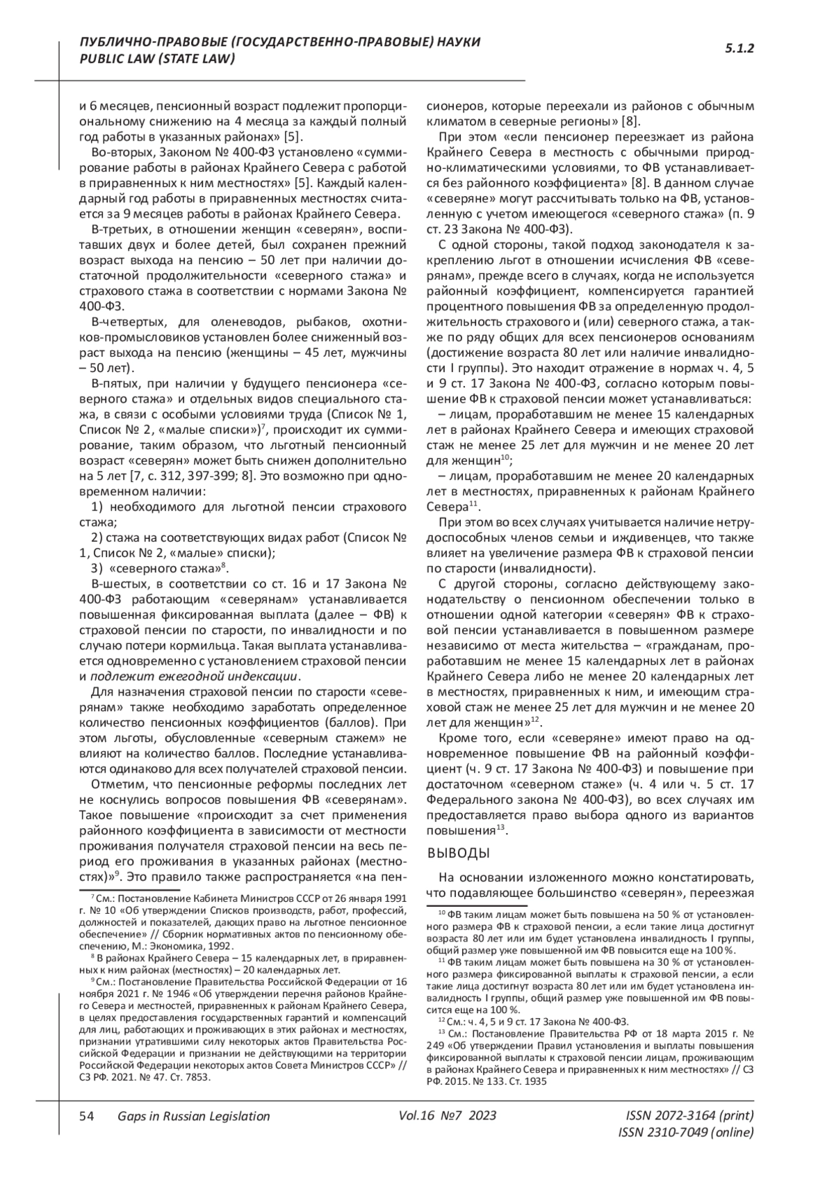 Отметим, что такие качественные особенности получателя пенсии, как проживание и (или) работа в особых природно-климатических условиях, в ходе реформирования пенсионной системы Российской Федерации не в полной мере учитываются законодателем [7; 9].