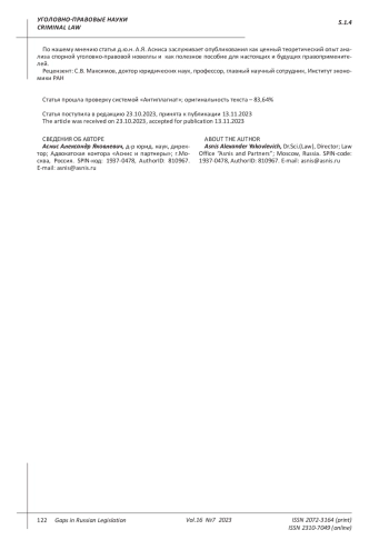 Asnis A. Ya. New official crimes: prerequisites for criminalization and qualifications. Monograph. M.: Prospekt, 2021. 128 p.