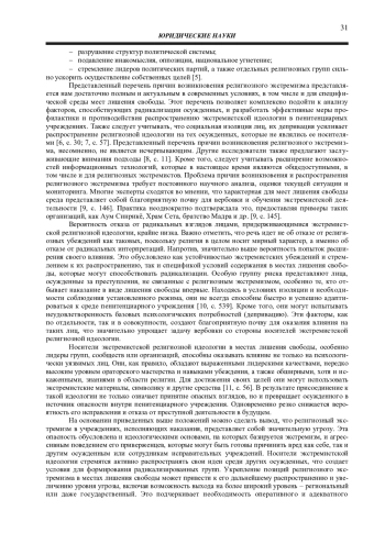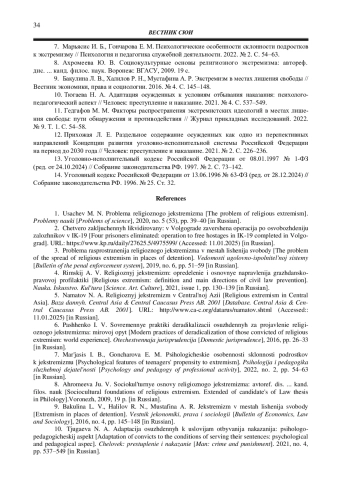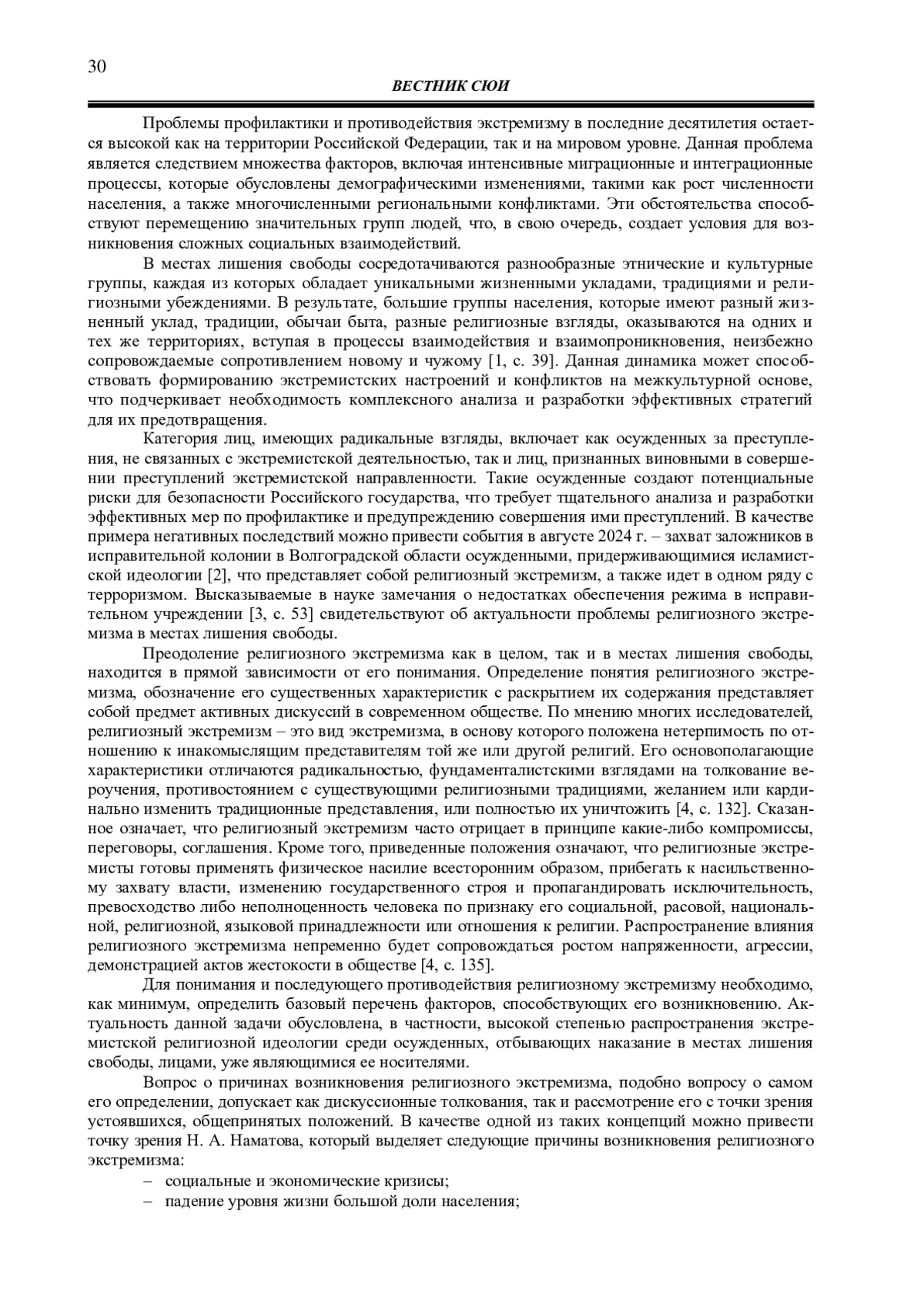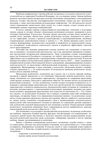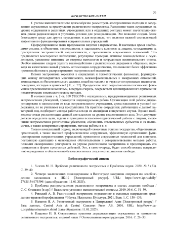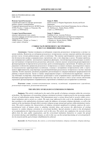 Статья посвящена исследованию сущности религиозного экстремизма в местах лишения свободы. Важность исследования религиозного экстремизма в местах лишения свободы обусловлена ростом числа случаев радикализации среди осужденных. Это явление представляет серьезную угрозу как для безопасности внутри исправительных учреждений, так и для общества в целом. Основная проблема, рассматриваемая в работе, заключается в выявлении факторов, способствующих радикализации осужденных под влиянием экстремистских религиозных идеологий, а также анализе механизмов распространения и функционирования экстремистских религиозных групп в пенитенциарных учреждениях. В статье рассматриваются особенности проявления религиозного экстремизма в условиях изоляции, анализируются социально-психологические характеристики осужденных, склонных к восприятию экстремистских идей, и оценивается эффективность существующих мер противодействия религиозному экстремизму в местах лишения свободы. Особое внимание уделяется разработке рекомендаций по совершенствованию профилактической работы в данной области. Также в статье затрагивается вопрос о необходимости выработки совместных действий государства, общественных организаций и самих исправительных учреждений для противодействия распространению экстремистской идеологии, так как только в этом случае можно обеспечить нормальное функционирование исправительных учреждений и добиться цели исправления осужденных.