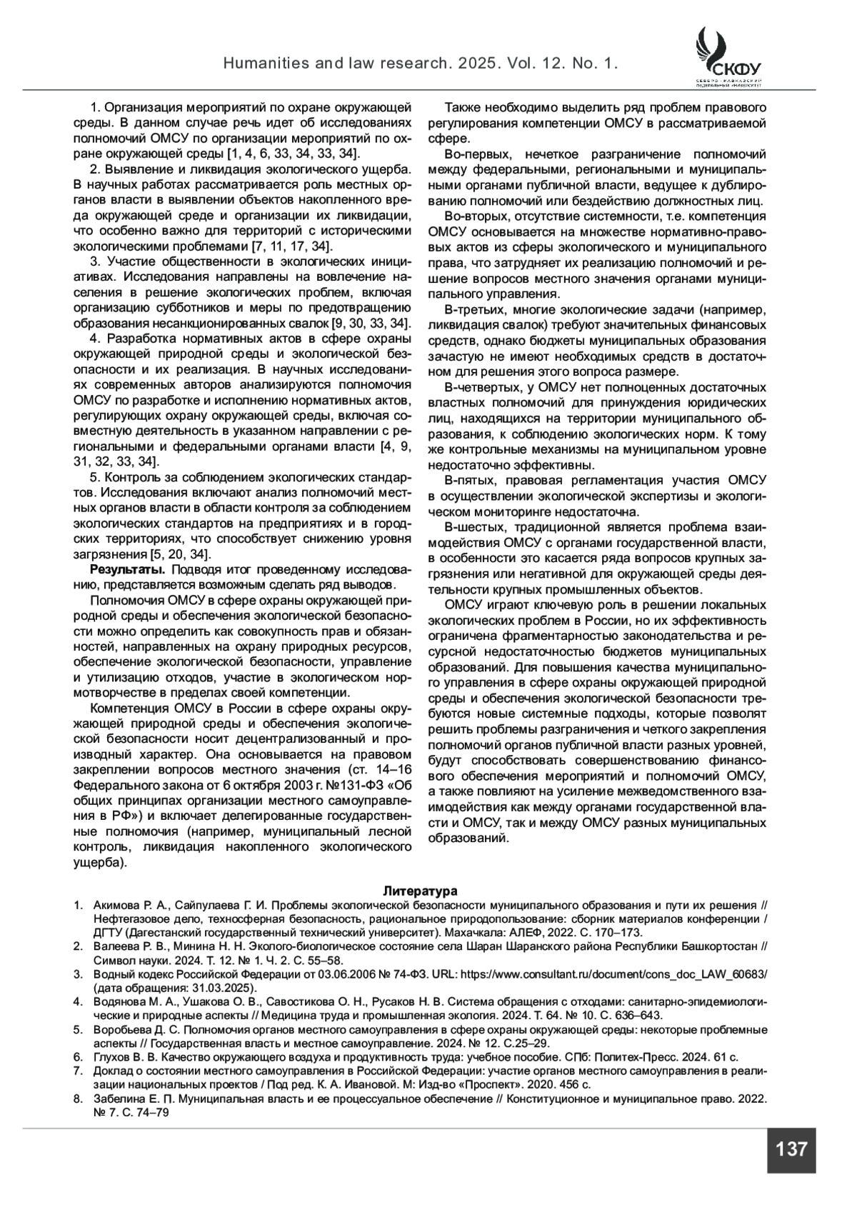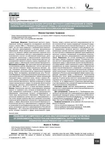 5. Воробьева Д. С. Полномочия органов местного самоуправления в сфере охраны окружающей среды: некоторые проблемные аспекты // Государственная власть и местное самоуправление. 2024. № 12. С.25-29.