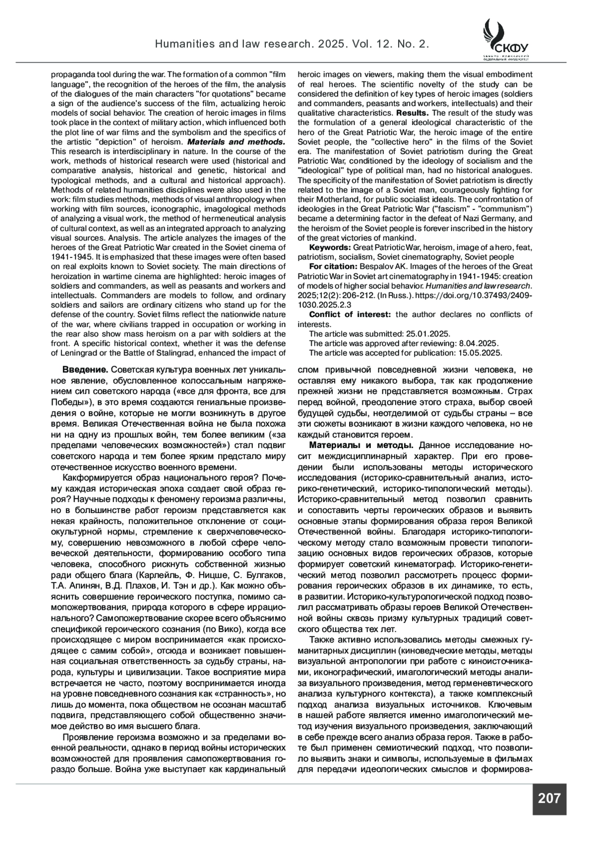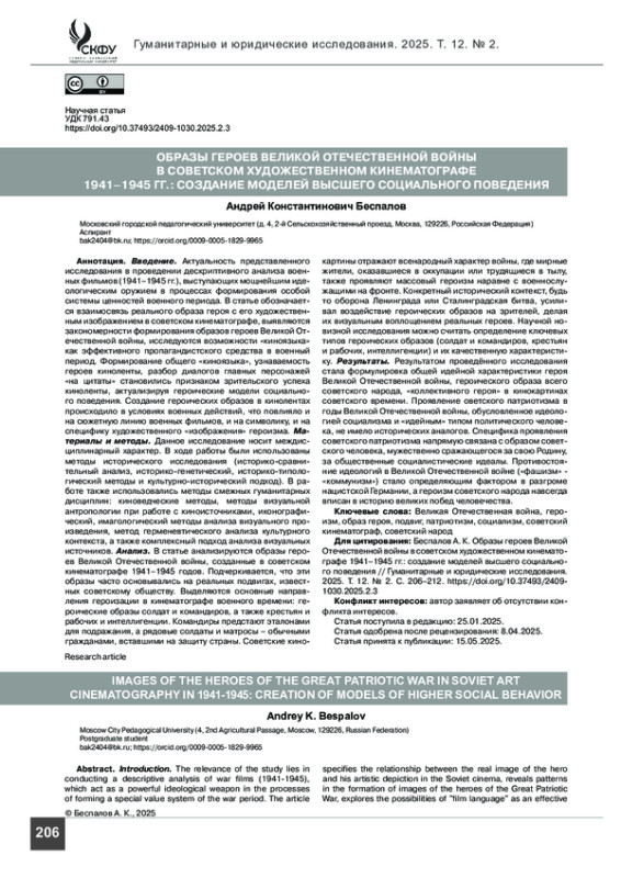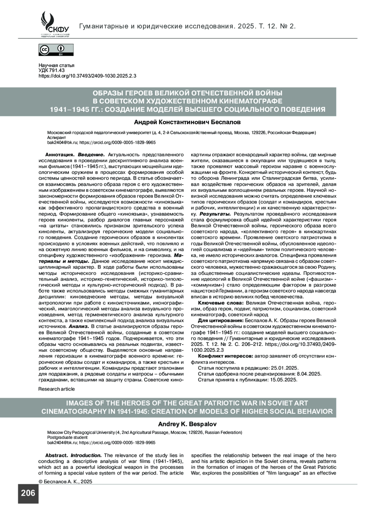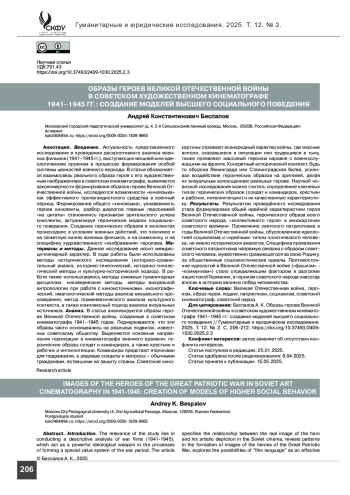БЕСПАЛОВ А. К. ОБРАЗЫ ГЕРОЕВ ВЕЛИКОЙ ОТЕЧЕСТВЕННОЙ ВОЙНЫ В СОВЕТСКОМ ХУДОЖЕСТВЕННОМ КИНЕМАТОГРАФЕ 1941–1945 ГГ.: СОЗДАНИЕ МОДЕЛЕЙ ВЫСШЕГО СОЦИАЛЬНОГО ПОВЕДЕНИЯ // ГУМАНИТАРНЫЕ И ЮРИДИЧЕСКИЕ ИССЛЕДОВАНИЯ. 2025. ТОМ 12, № 2