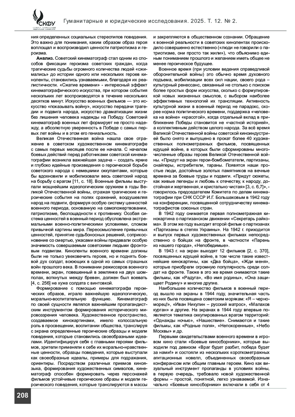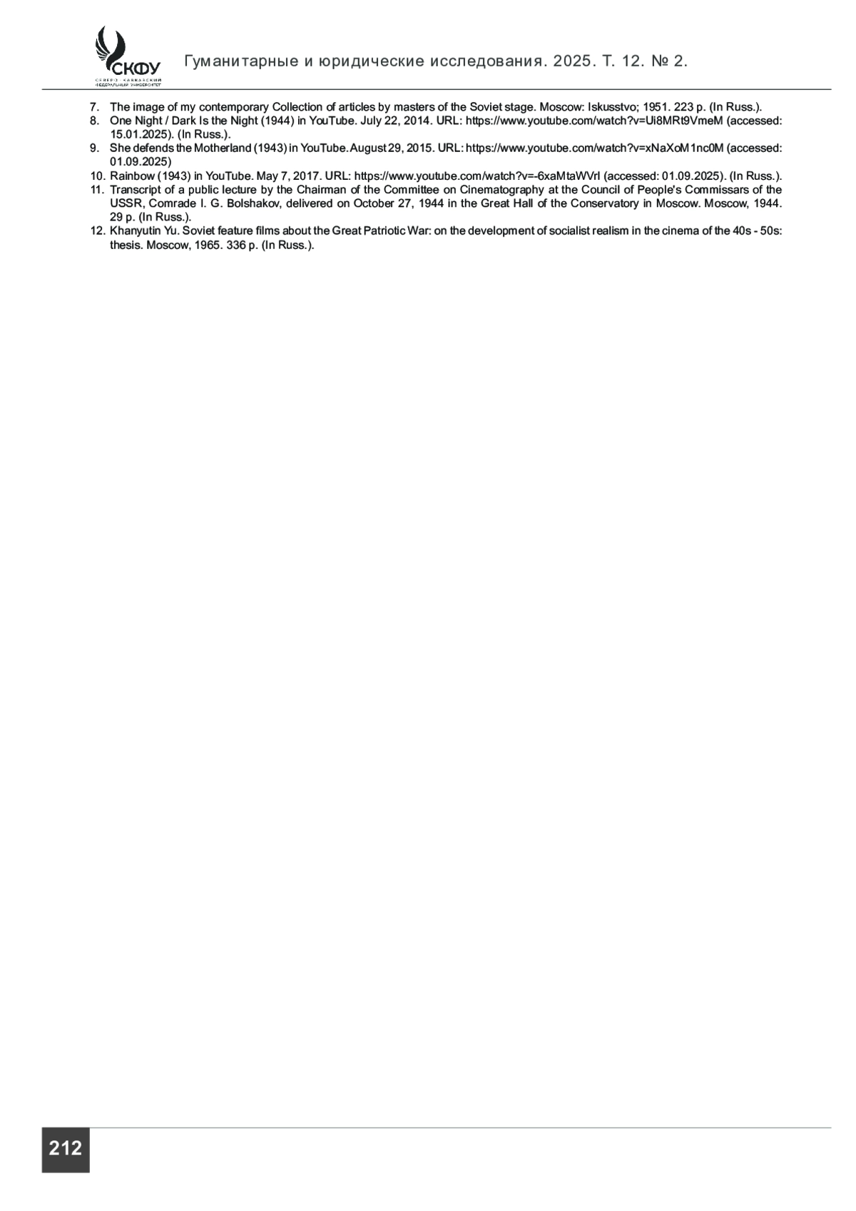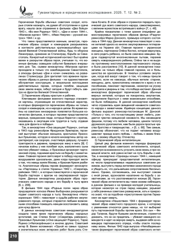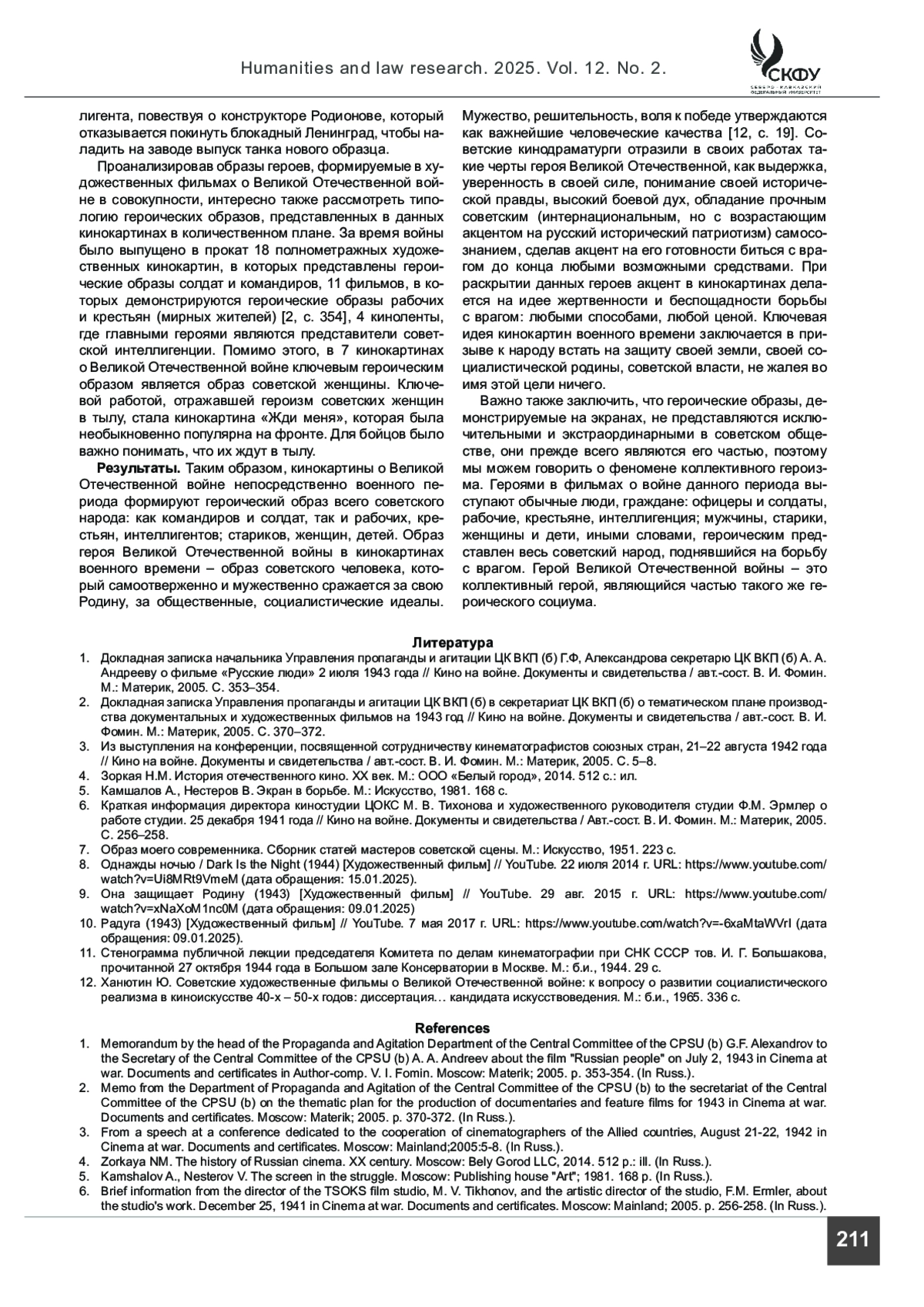 БЕСПАЛОВ А. К. ОБРАЗЫ ГЕРОЕВ ВЕЛИКОЙ ОТЕЧЕСТВЕННОЙ ВОЙНЫ В СОВЕТСКОМ ХУДОЖЕСТВЕННОМ КИНЕМАТОГРАФЕ 1941–1945 ГГ.: СОЗДАНИЕ МОДЕЛЕЙ ВЫСШЕГО СОЦИАЛЬНОГО ПОВЕДЕНИЯ // ГУМАНИТАРНЫЕ И ЮРИДИЧЕСКИЕ ИССЛЕДОВАНИЯ. 2025. ТОМ 12, № 2