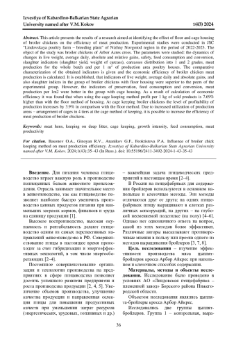 В данной статье представлены результаты исследования, направленного на выявление влияния напольного и клеточного содержания цыплят-бройлеров на эффективность производства мяса. Экспериментальные исследования были проведены в АО «Линдовская птицефабрика - племенной завод» Нижегородской области в период 2022-2023 г. Объектом исследования послужили цыплята-бройлеры кросса Арбор Айкрес. Были исследованы показатели: динамика изменения живой массы, среднесуточные, абсолютные и относительные приросты, сохранность, расход и конверсия корма, убойные показатели (убойный выход, масса тушки), распределение тушек на 1 и 2 сорт, производство мяса за всю партию и на 1 м2 производственной площади птичников. Дана сравнительная характеристика полученных показателей и рассчитана экономическая эффективность производства мяса цыплят-бройлеров. Установлено, что показатели живой массы, среднесуточных и абсолютных приростов, а также убойные показатели у группы цыплят-бройлеров с напольным содержанием превосходили над сверстниками опытной группы. В то же время показатели сохранности, расхода и конверсии корма, производства мяса на 1 м2 были лучше у группы с клеточным содержанием. В результате расчета экономической эффективности было установлено, что при использовании клеточного способа содержания прибыль с 1 кг реализуемой продукции больше на 7,69%, чем при использовании напольного способа содержания. При клеточном содержании цыплят-бройлеров уровень рентабельности производства повышается на 3,9% по сравнению с напольным. За счет усиленного использования производственных площадей - расположение клеток в 4 яруса при клеточном способе содержания - можно повысить эффективность производства мяса цыплят-бройлеров.
