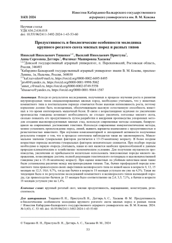 7. Экстерьерно-конституциональные особенности коров в зависимости от возраста и генотипов / Т. Т. Тарчоков, Х. М. Гасараева, М. Г. Тлейншева, З. М. Айсанов, Р. З. Абдулхаликов, М. М. Шахмурзов // Вестник КрасГАУ. 2023. № 5(194). С. 163-171. DOI: 10.36718/1819-4036-2023-5-163-171 EDN: OOXTDP