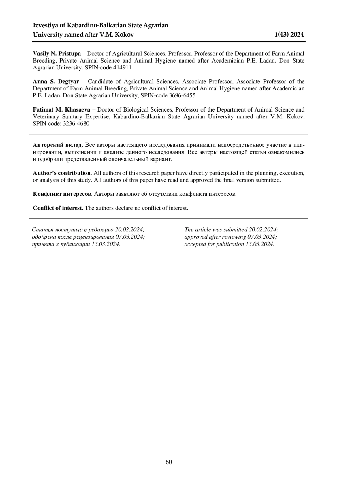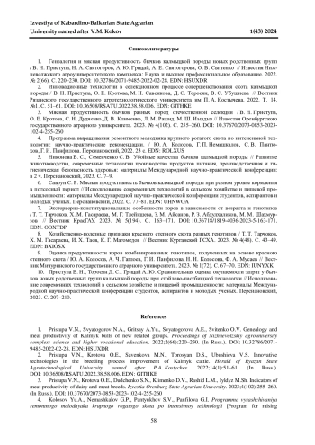 2. Инновационные технологии в селекционном процессе совершенствования скота калмыцкой породы / В. Н. Приступа, О. Е. Кротова, М. Н. Савенкова, Д. С. Торосян, В. С. Убушиева // Вестник Рязанского государственного агротехнологического университета им. П. А. Костычева. 2022. Т. 14. №1. С. 51-61. DOI: 10.36508/RSATU.2022.38.58.006 EDN: GITHKE