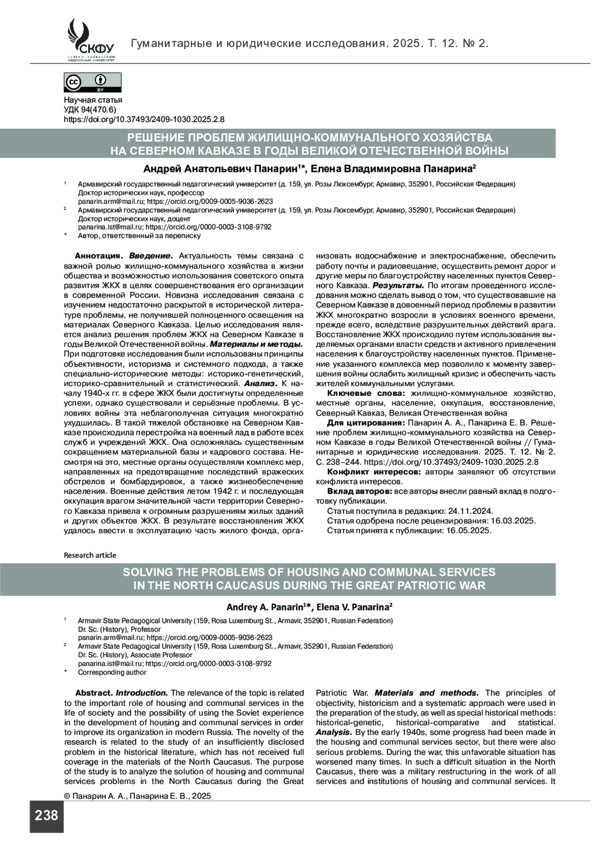 Результаты. По итогам проведенного исследования можно сделать вывод о том, что существовавшие на Северном Кавказе в довоенный период проблемы в развитии ЖКХ многократно возросли в условиях военного времени, прежде всего, вследствие разрушительных действий врага. Восстановление ЖКХ происходило путем использования выделяемых органами власти средств и активного привлечения населения к благоустройству населенных пунктов. Применение указанного комплекса мер позволило к моменту завершения войны ослабить жилищный кризис и обеспечить часть жителей коммунальными услугами.