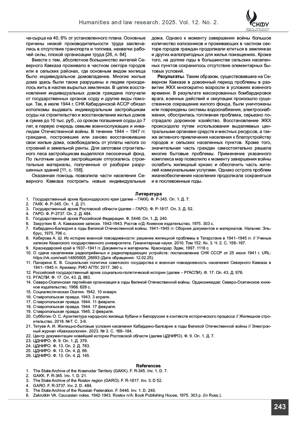 21. Тетуев А. И. Жилищно-бытовые условия населения Кабардино-Балкарии в годы Великой Отечественной войны // Электронный журнал «Кавказология». 2023. № 3. С. 169-184.