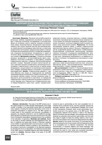 Результаты. По итогам исследования делается вывод о выборе ставропольским крестьянством простых малых и больших товариществ в качестве приемлемой формы коллективного хозяйствования. Осуществлённая историческая реконструкция производственных отношений и социального взаимодействия, складывавшихся в рамках каждой формы коллективных хозяйств в годы нэпа, подтвердила необходимость их вербально-понятийного описания, последовательно выполненного в рамках статьи.