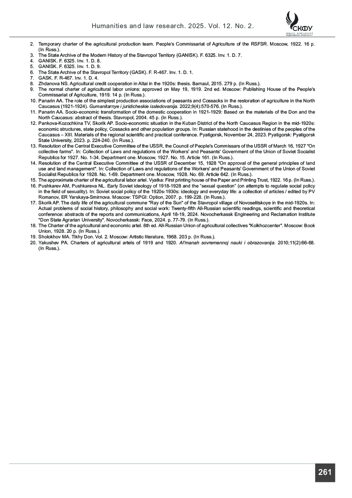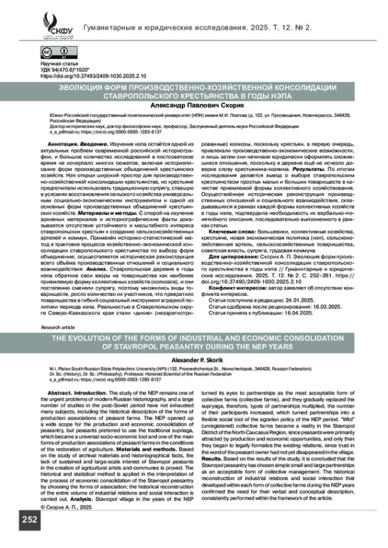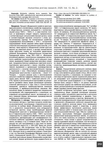 10. Панарин А. А. Роль простейших производственных объединений крестьянства и казачества в восстановлении сельского хозяйства Северного Кавказа (1921-1924 гг.) // Гуманитарные и юридические исследования. 2022. Т. 9 (4). С. 570-576.