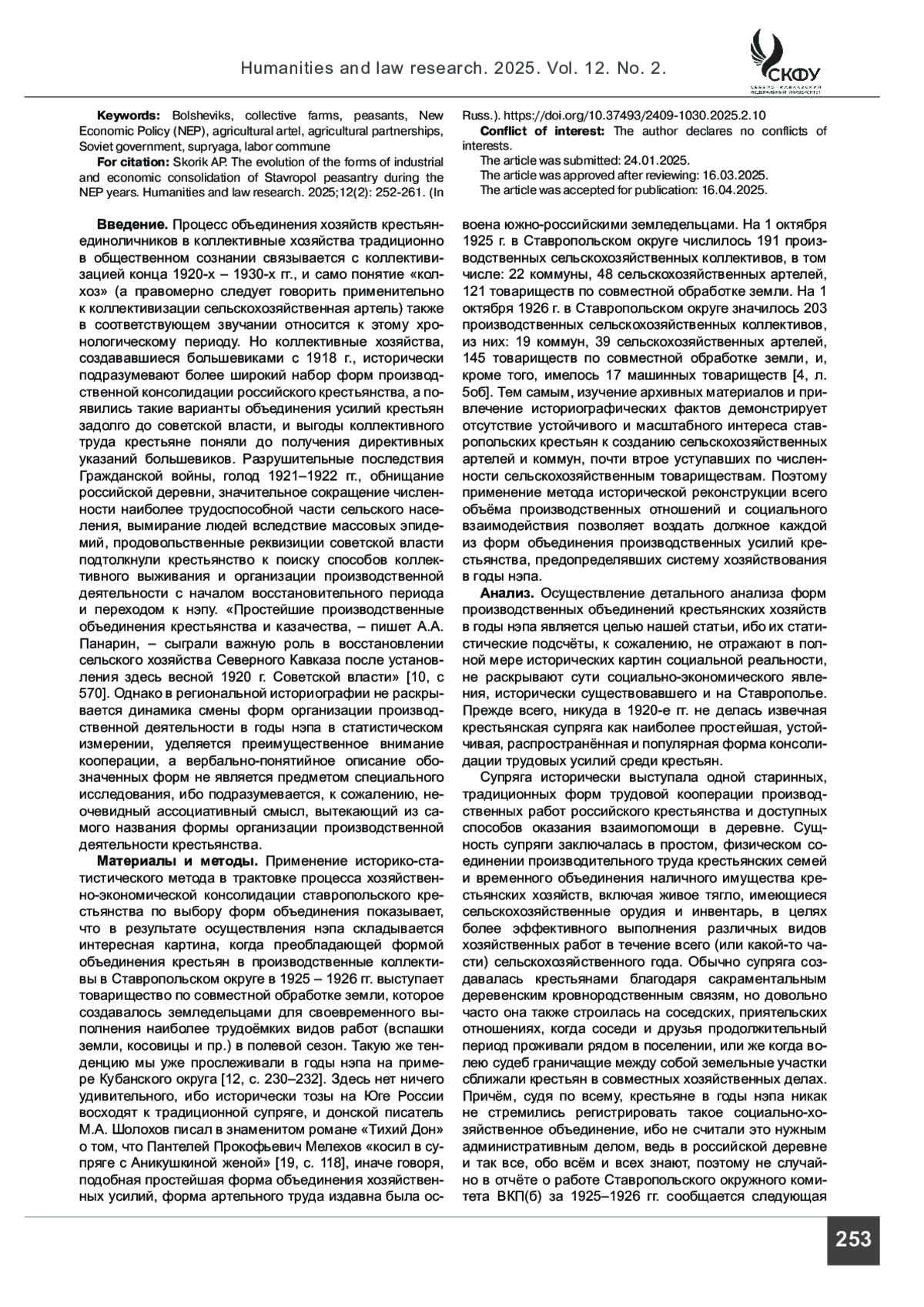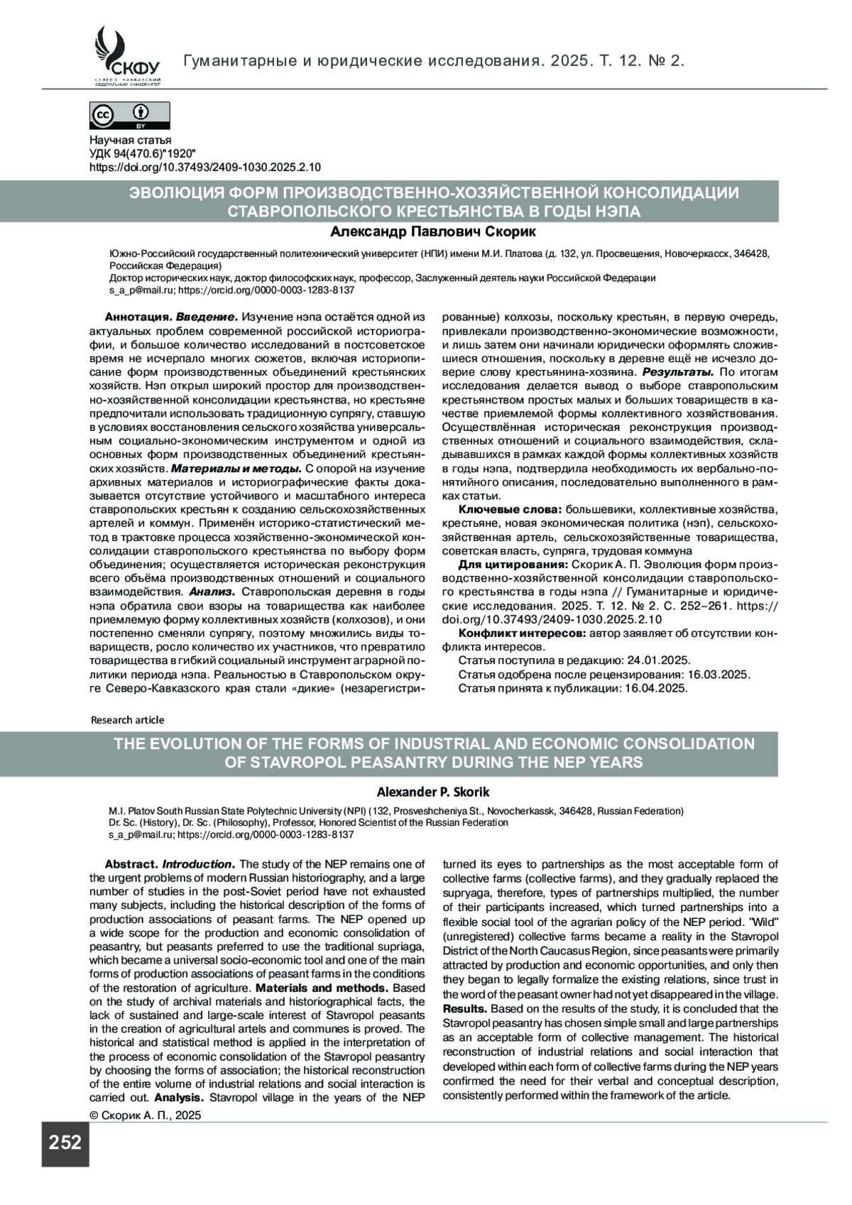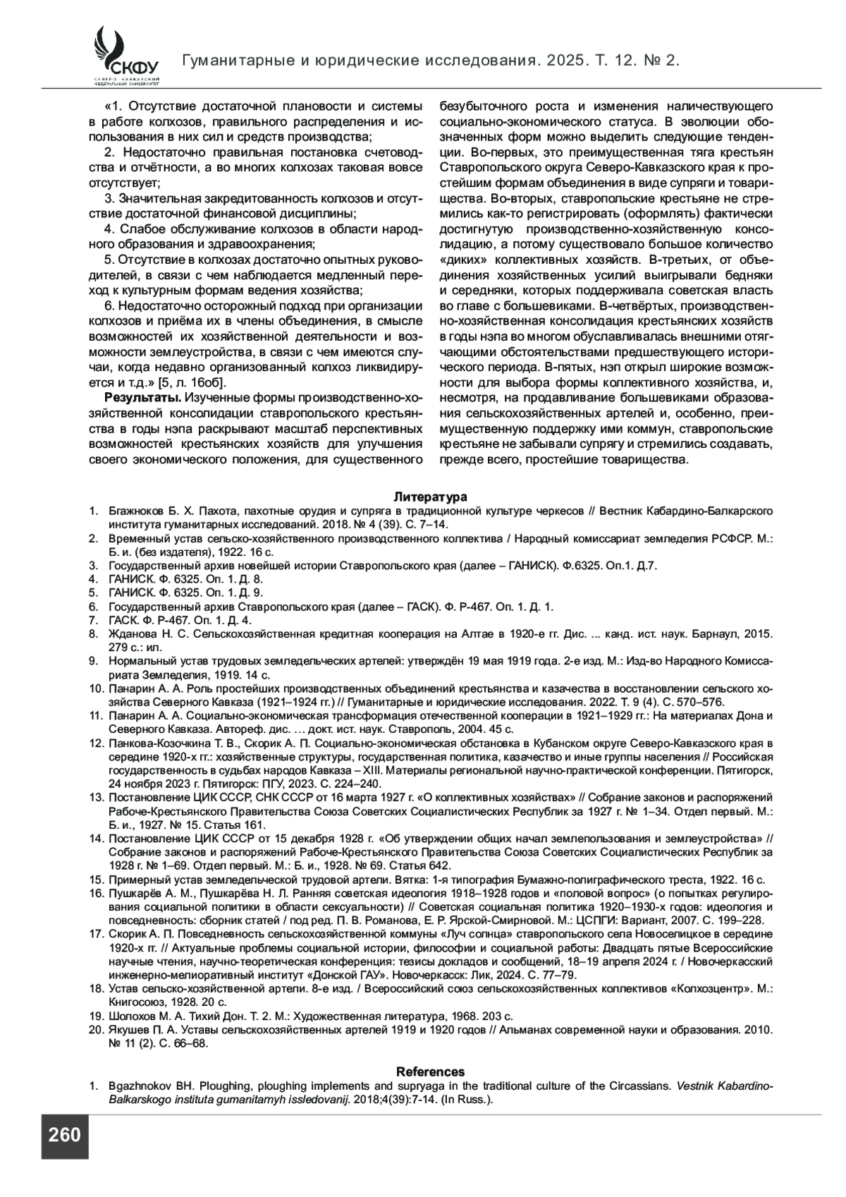 12. Панкова-Козочкина Т. В., Скорик А. П. Социально-экономическая обстановка в Кубанском округе Северо-Кавказского края в середине 1920-х гг.: хозяйственные структуры, государственная политика, казачество и иные группы населения // Российская государственность в судьбах народов Кавказа - XIII. Материалы региональной научно-практической конференции. Пятигорск, 24 ноября 2023 г. Пятигорск: ПГУ, 2023. С. 224-240.