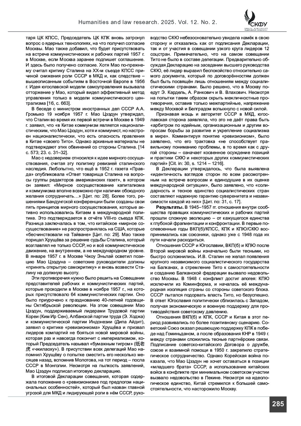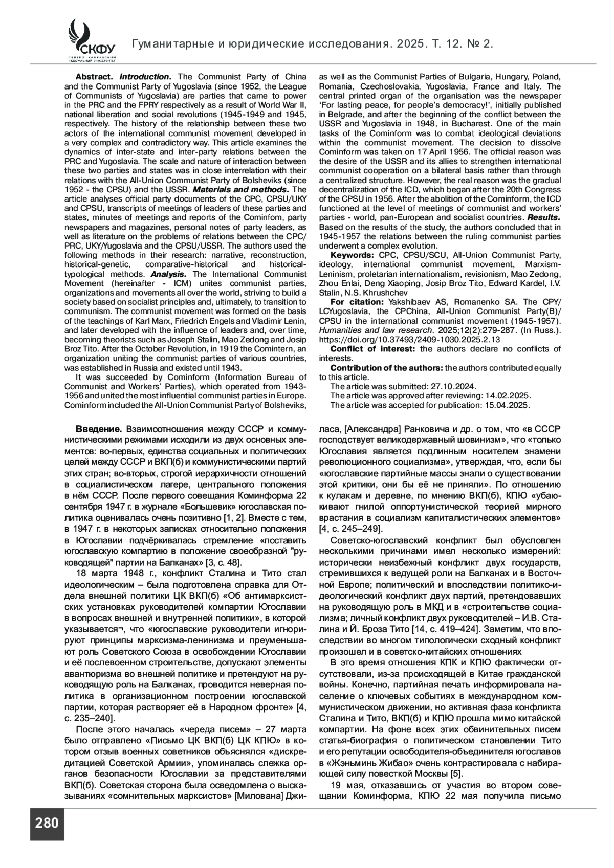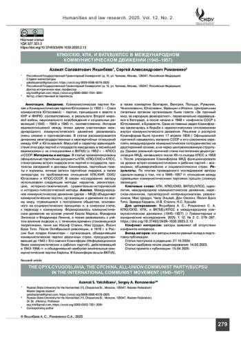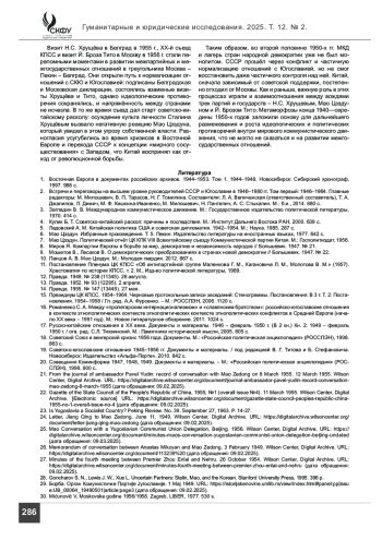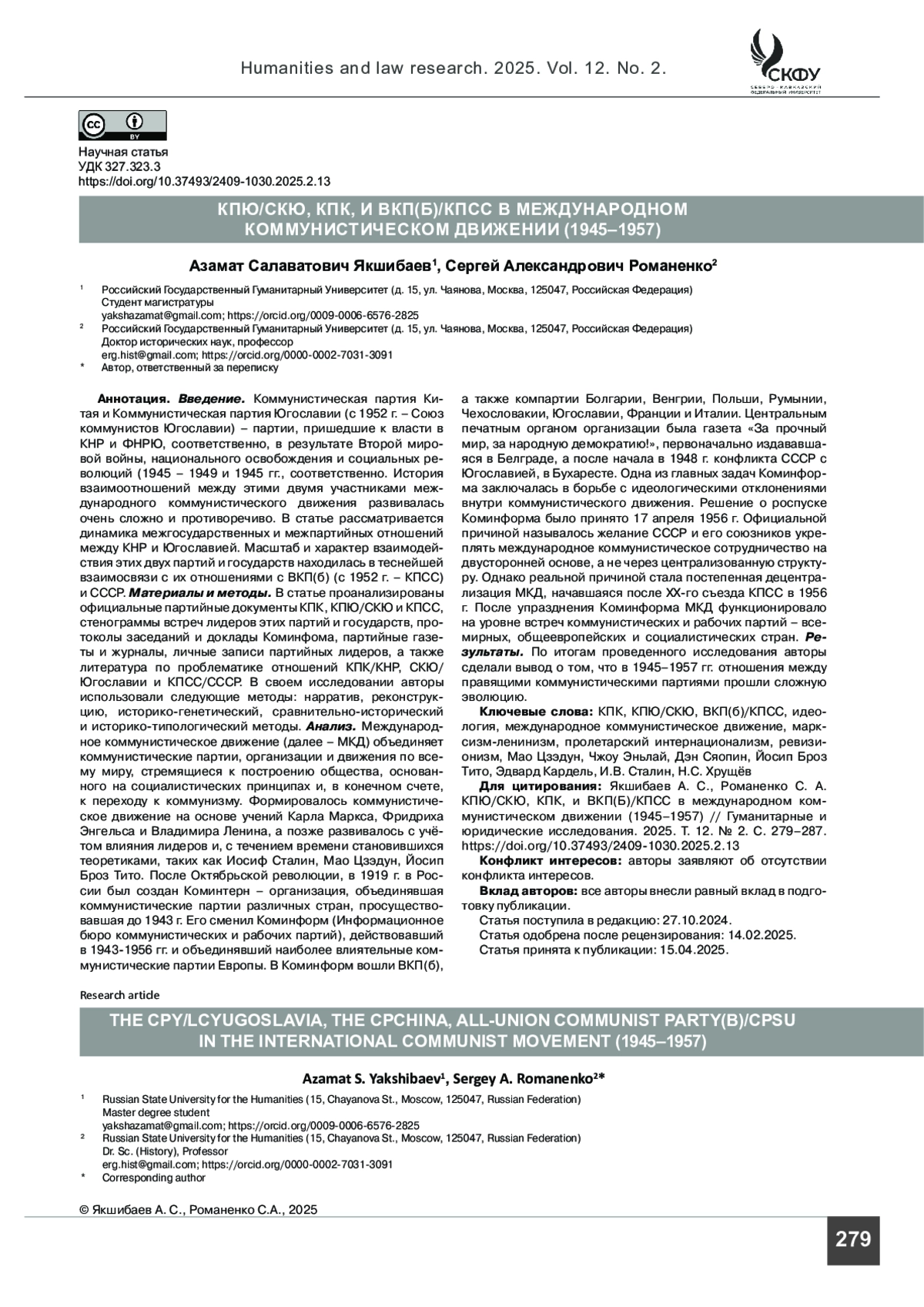 ЯКШИБАЕВ А. С., РОМАНЕНКО С. А. КПЮ/СКЮ, КПК, И ВКП(Б)/КПСС В МЕЖДУНАРОДНОМ КОММУНИСТИЧЕСКОМ ДВИЖЕНИИ (1945–1957) // ГУМАНИТАРНЫЕ И ЮРИДИЧЕСКИЕ ИССЛЕДОВАНИЯ. 2025. ТОМ 12, № 2