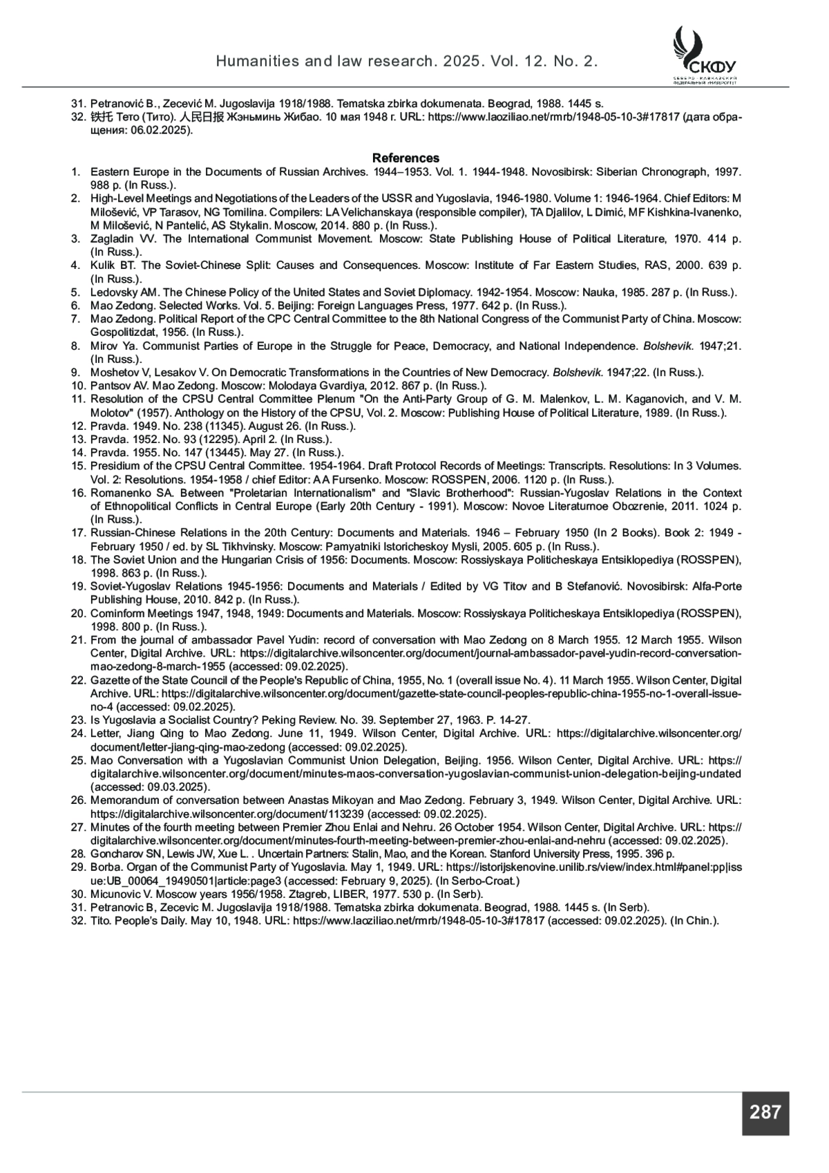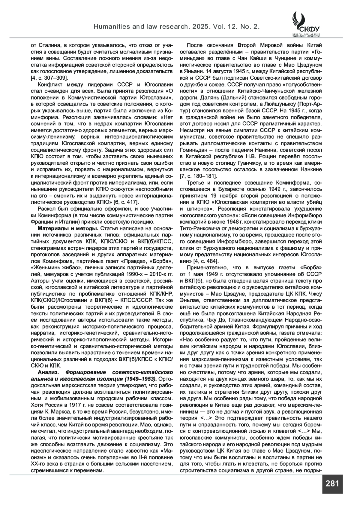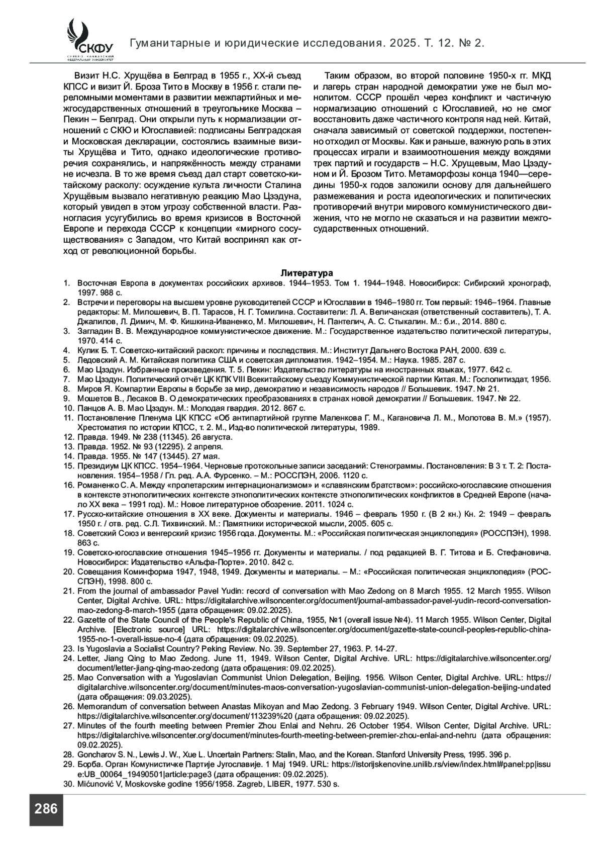 ЯКШИБАЕВ А. С., РОМАНЕНКО С. А. КПЮ/СКЮ, КПК, И ВКП(Б)/КПСС В МЕЖДУНАРОДНОМ КОММУНИСТИЧЕСКОМ ДВИЖЕНИИ (1945–1957) // ГУМАНИТАРНЫЕ И ЮРИДИЧЕСКИЕ ИССЛЕДОВАНИЯ. 2025. ТОМ 12, № 2