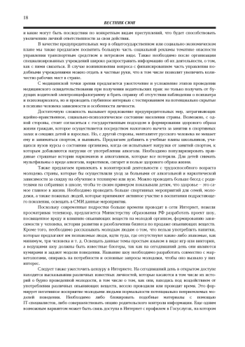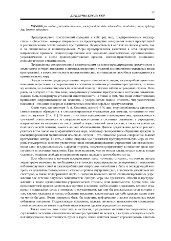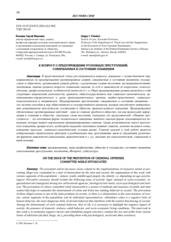 В представленной статье рассматриваются вопросы, связанные с осуществлением мер, направленных на предупреждение противоправных деяний, совершаемых в состоянии опьянения, государством и обществом, организацией данной работы с различными слоями населения: несовершеннолетними, молодежью, лицами среднего возраста, пожилыми людьми, то есть в зависимости от возрастных, психологических, профессиональных особенностей личности и т. д. Меры предупреждения должны включать в себя следующие направления деятельности: правовое, общегосударственное или социально-экономическое, организационно-управленческое в среде правоохранительных органов, идейно-нравственное, социально-психологическое и медицинское. Предупреждение преступлений, совершаемых в состоянии опьянения, - это система способов и мер общественного и государственного контроля, которая способствует нейтрализации детерминантов преступности, воспитанию в обществе правопослушного поведения. Предупреждение обозначенных противоправных действий - одна из главных проблем в обществе, так как происходит деформация в сознании в обществе, отдельных слоев населения, отдельных его представителей. «Пьяная» преступность - это негативная форма человеческого поведения, наиболее опасная форма отклоняющегося поведения, которая мешает нормальному функционированию социума. Среди детерминантов такого преступного поведения, прежде всего, необходимо выделить негативное влияние социума, наличие насилия в семье, поведение взрослых, социально-экономические условия жизни. Главной задачей в этой работе является нейтрализация отрицательных факторов и реабилитация лиц, преступивших закон и страдающих различными формами зависимости (алкогольной, наркотической и т. д.), оказание им психологической, социальной и иной помощи.