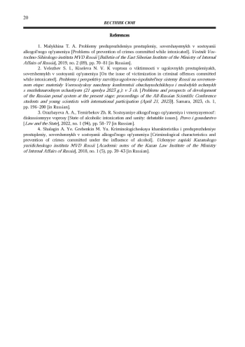1. Малыхина Т. А. Проблемы предупреждения преступлений, совершаемых в состоянии алкогольного опьянения // Вестник Восточно-Сибирского института МВД России. 2019. № 2 (89). С. 70-81.