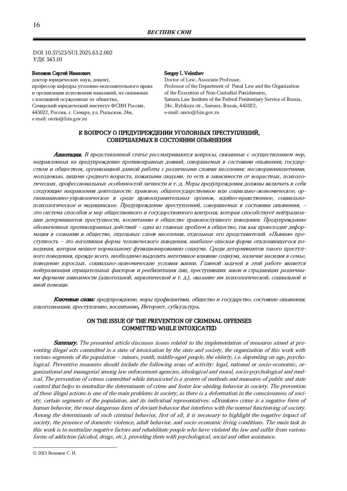 2. Вележев С. И., Киселева Н. В. К вопросу о виктимности в уголовных преступлениях, совершенных в состоянии опьянения // Проблемы и перспективы развития уголовно-исполнительной системы России на современном этапе: материалы Всероссийской научной конференции обучающихся и молодых ученых с международным участием (21 апреля 2023 г.): в 3 ч. Самара: Самарский юридический институт ФСИН России, 2023. Ч. 1. С. 196-200.