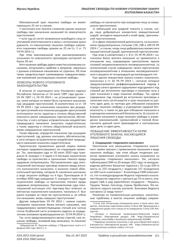 Статья: ЛИШЕНИЕ СВОБОДЫ ПО НОВОМУ УГОЛОВНОМУ ЗАКОНУ РЕСПУБЛИКИ КАЗАХСТАН (2023)