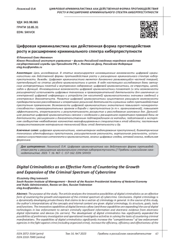 ЦИФРОВАЯ КРИМИНАЛИСТИКА КАК ДЕЙСТВЕННАЯ ФОРМА ПРОТИВОДЕЙСТВИЯ РОСТУ И РАСШИРЕНИЮ КРИМИНАЛЬНОГО СПЕКТРА КИБЕРПРЕСТУПНОСТИ