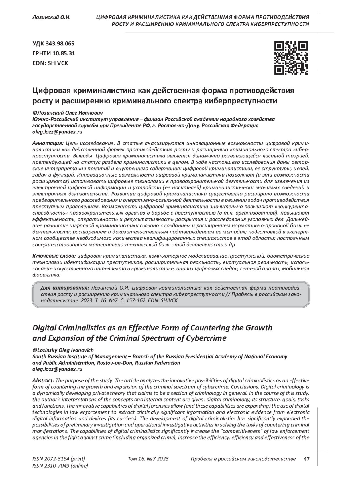 Mezentseva A.I. On the issue of individual problems of digital criminology // International scientific journal “Bulletin of Science”. 2021. No. 12 (45). Vol. 2. pp. 86-91.