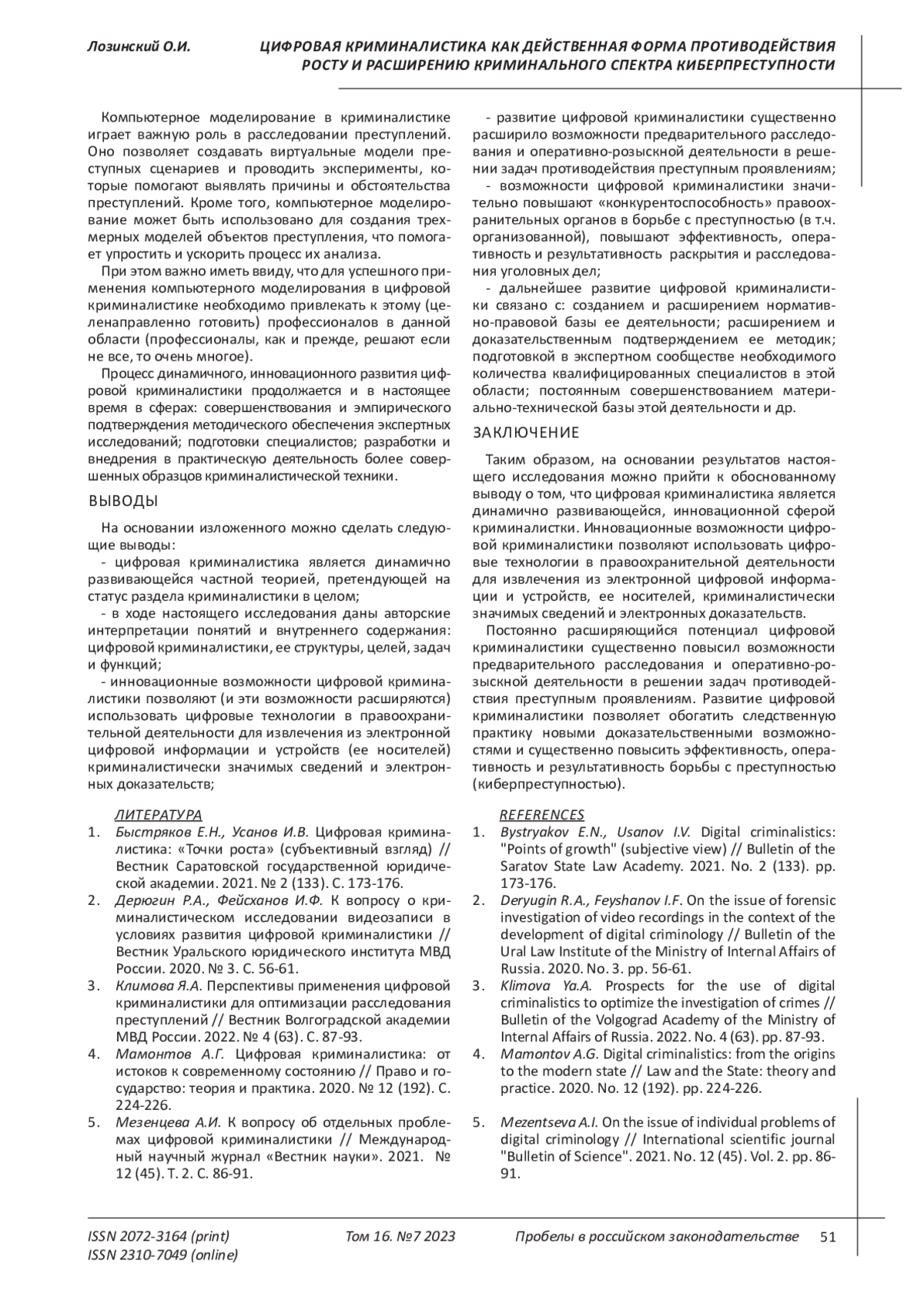 1. Быстряков Е.Н., Усанов И.В. Цифровая криминалистика: “Точки роста” (субъективный взгляд) // Вестник Саратовской государственной юридической академии. 2021. № 2 (133). С. 173-176.