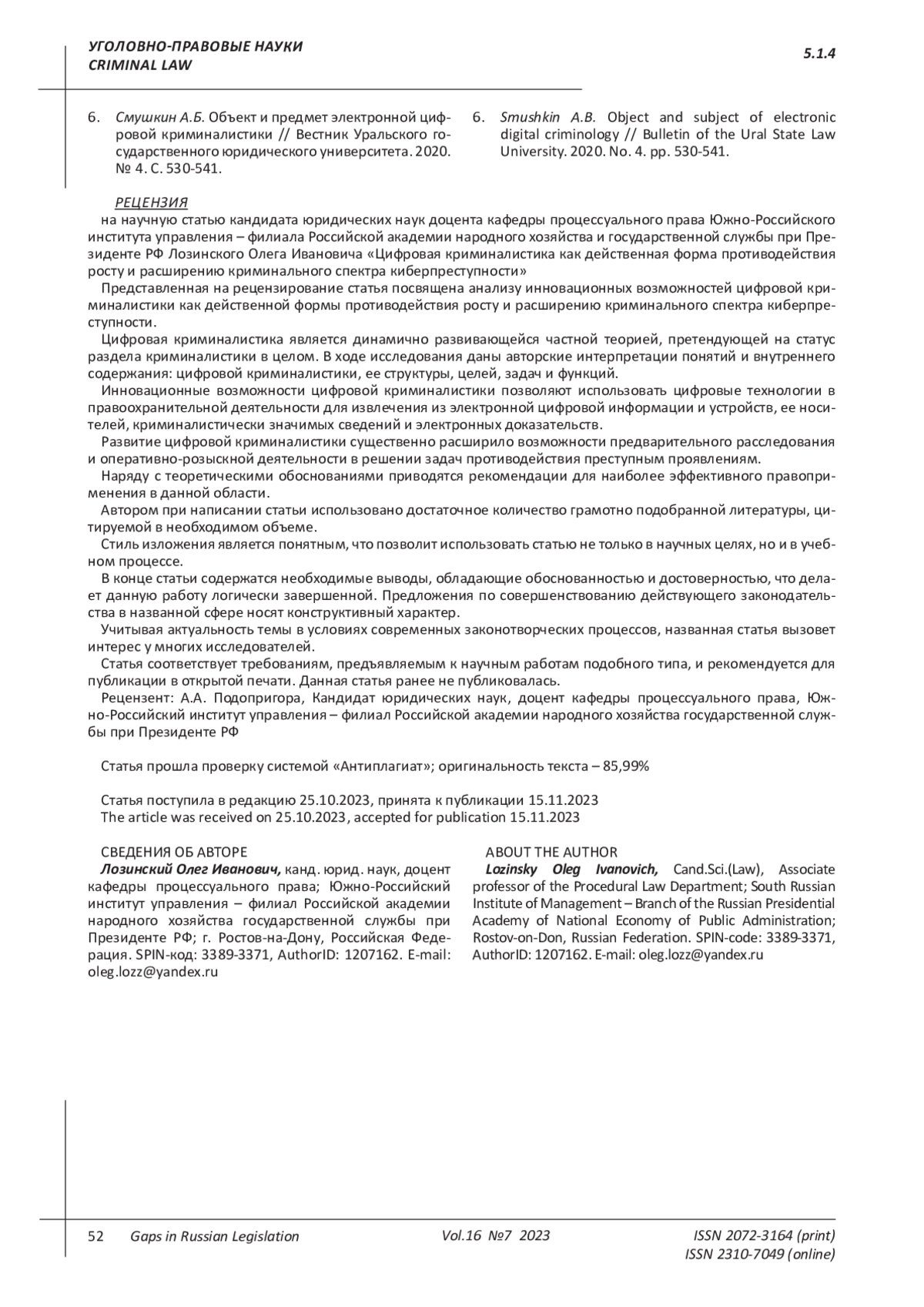 6. Смушкин А.Б. Объект и предмет электронной цифровой криминалистики // Вестник Уральского государственного юридического университета. 2020. № 4. С. 530-541. EDN: DLVPQV