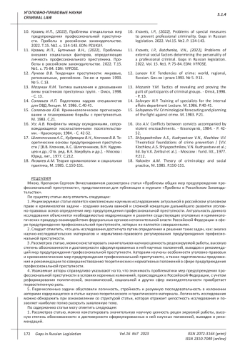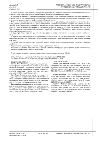 Kravets, I.P., (2022), Problems of special measures to prevent professional criminality. Gaps in Russian legislation. 2022. Vol.15. №2. P. 134-143. EDN: PZUKUF