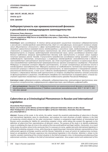 10. Тропина Т.Л. Киберпреступность: понятие, состояние, уголовно-правовые меры борьбы.: дис. … канд. юрид. наук. Владивосток. 2005. EDN: NNKIKF