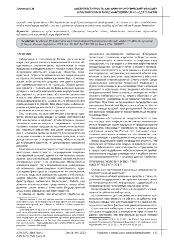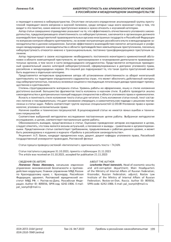 Автор подчеркивает в своем исследовании необходимость постоянного мониторинга криминогенной обстановки в области компьютерной преступности, ее прогнозирования и планирования деятельности правоохранительных органов, в том числе в части международного сотрудничества. Представляется интересным проведенный сравнительный анализ категорий киберпреступлений, сформулированных в доктрине уголовного права, российских и международных нормах. Это лишний раз подчеркивает то, что такая группа преступлений может быть выделена в отдельную категорию. Представляется интересным предложение автора об установлении ответственности за оборот нелегальной криптовалюты на территории определенного содружества стран, что может обеспечить действенный контроль над киберпреступностыо, поскольку основные хищения и последующая легализация дохода происходит преимущественно в криптовалюте.