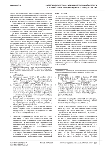 5. Указание Генпрокуратуры России № 401/11, МВД России № 2 от 19.06.2023 “О введении в действие перечней статей Уголовного кодекса Российской Федерации, используемых при формировании статистической отчетности” // - [Электронный ресурс]. - Режим доступа: https://docs.cntd.ru/document/1302059022.