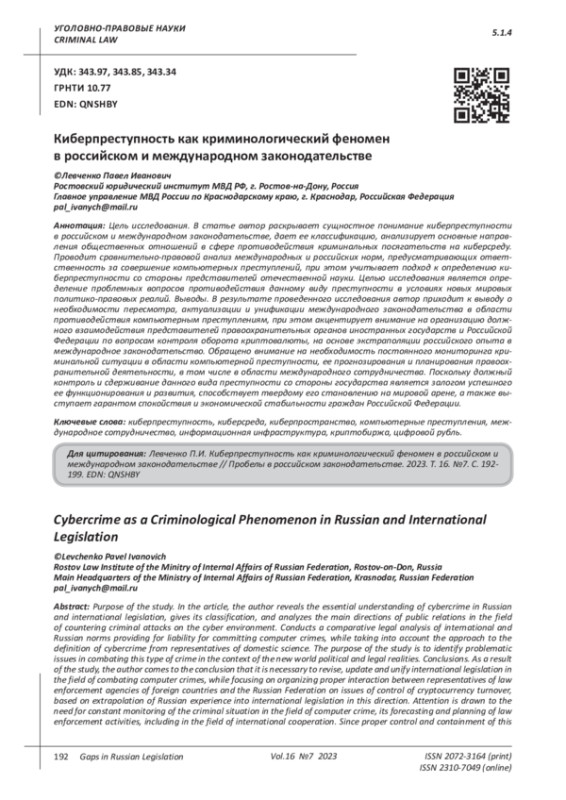 Цель исследования. В статье автор раскрывает сущностное понимание киберпреступности в российском и международном законодательстве, дает ее классификацию, анализирует основные направления общественных отношений в сфере противодействия криминальных посягательств на киберсреду. Проводит сравнительно-правовой анализ международных и российских норм, предусматривающих ответственность за совершение компьютерных преступлений, при этом учитывает подход к определению киберпреступности со стороны представителей отечественной науки. Целью исследования является определение проблемных вопросов противодействия данному виду преступности в условиях новых мировых политико-правовых реалий. Выводы. В результате проведенного исследования автор приходит к выводу о необходимости пересмотра, актуализации и унификации международного законодательства в области противодействия компьютерным преступлениям, при этом акцентирует внимание на организацию должного взаимодействия представителей правоохранительных органов иностранных государств и Российской Федерации по вопросам контроля оборота криптовалюты, на основе экстраполяции российского опыта в международное законодательство. Обращено внимание на необходимость постоянного мониторинга криминальной ситуации в области компьютерной преступности, ее прогнозирования и планирования правоохранительной деятельности, в том числе в области международного сотрудничества. Поскольку должный контроль и сдерживание данного вида преступности со стороны государства является залогом успешного ее функционирования и развития, способствует твердому его становлению на мировой арене, а также выступает гарантом спокойствия и экономической стабильности граждан Российской Федерации.