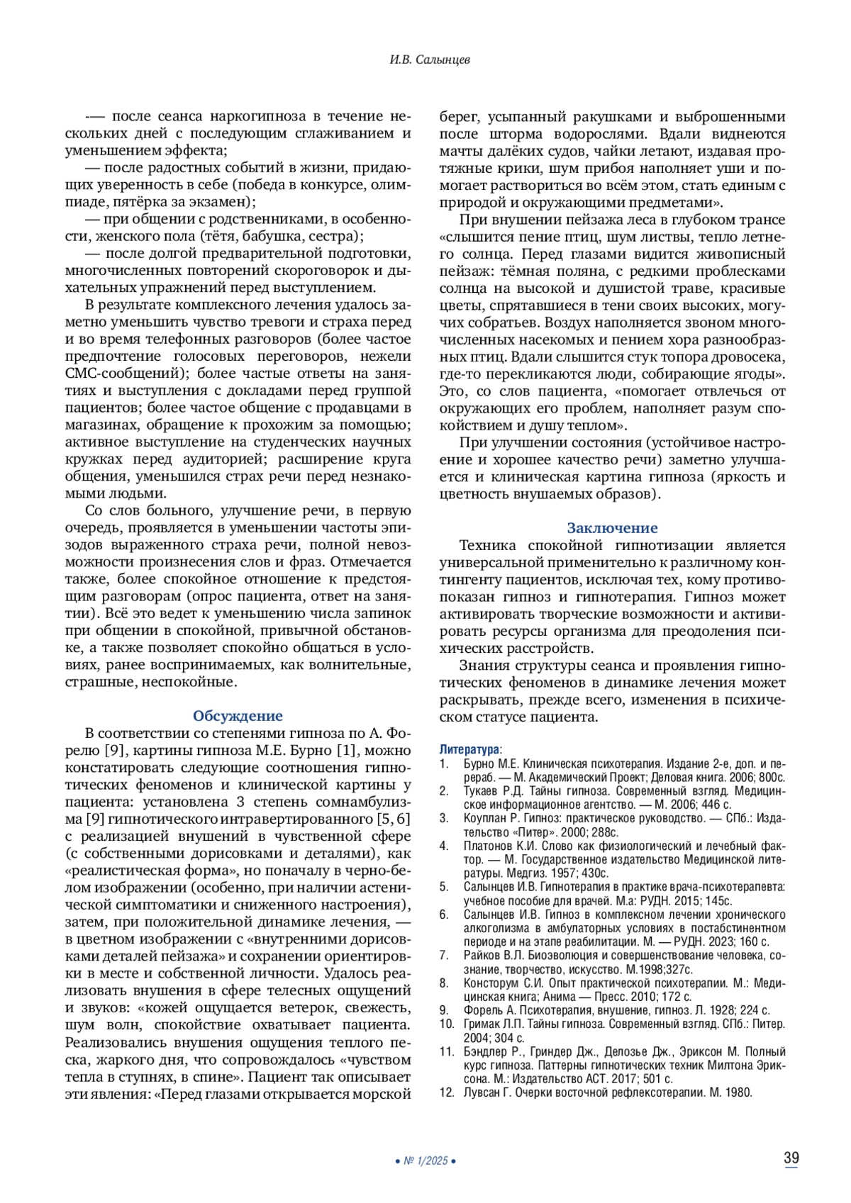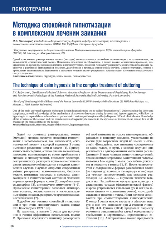 Одной из основных универсальных техник (методик) гипноза является спокойная гипнотизация с использованием, так называемой, «гипнотической песни». Понимание последних и соблюдение, а также знание механизмов процессов, возникающих во время пребывания в гипнозе и гипносуггестий, позволит гипнологу расширить количество исцеляемых пациентов с различной патологией и помогать диагностике в трудных клинических случаях. Знания структуры сеанса и проявления гипнотических феноменов в динамике лечения может раскрывать, прежде всего, изменения в психическом статусе пациента.
