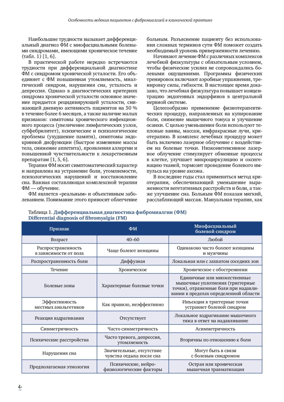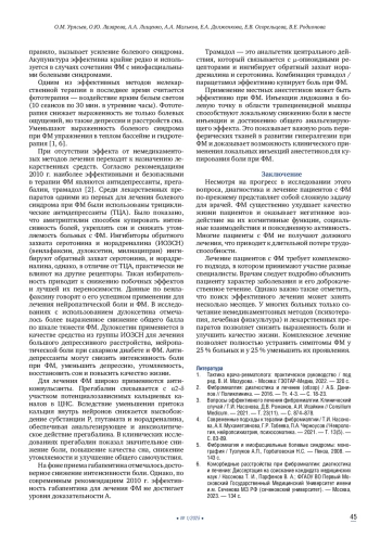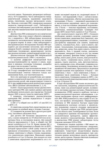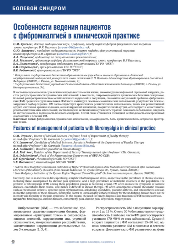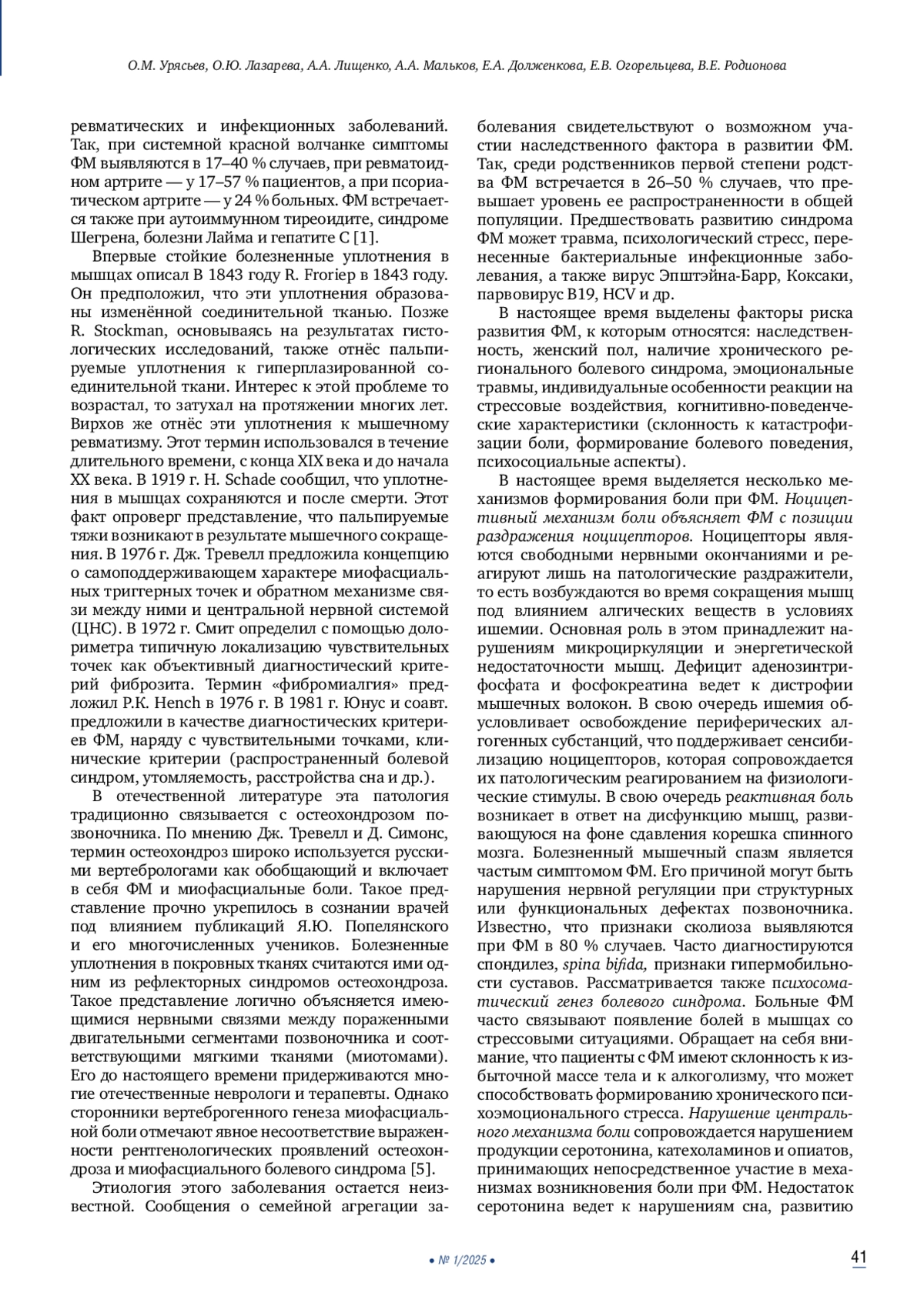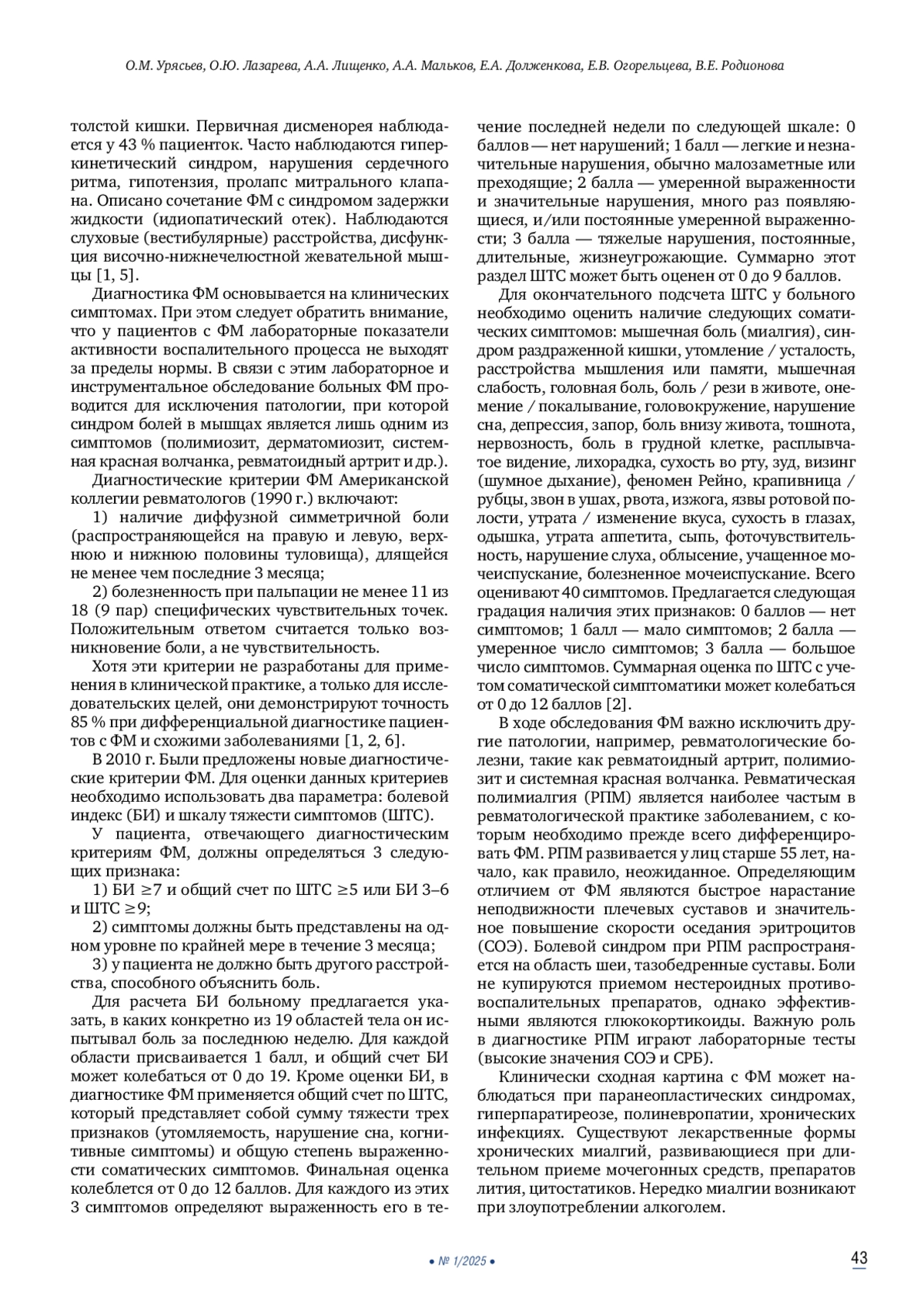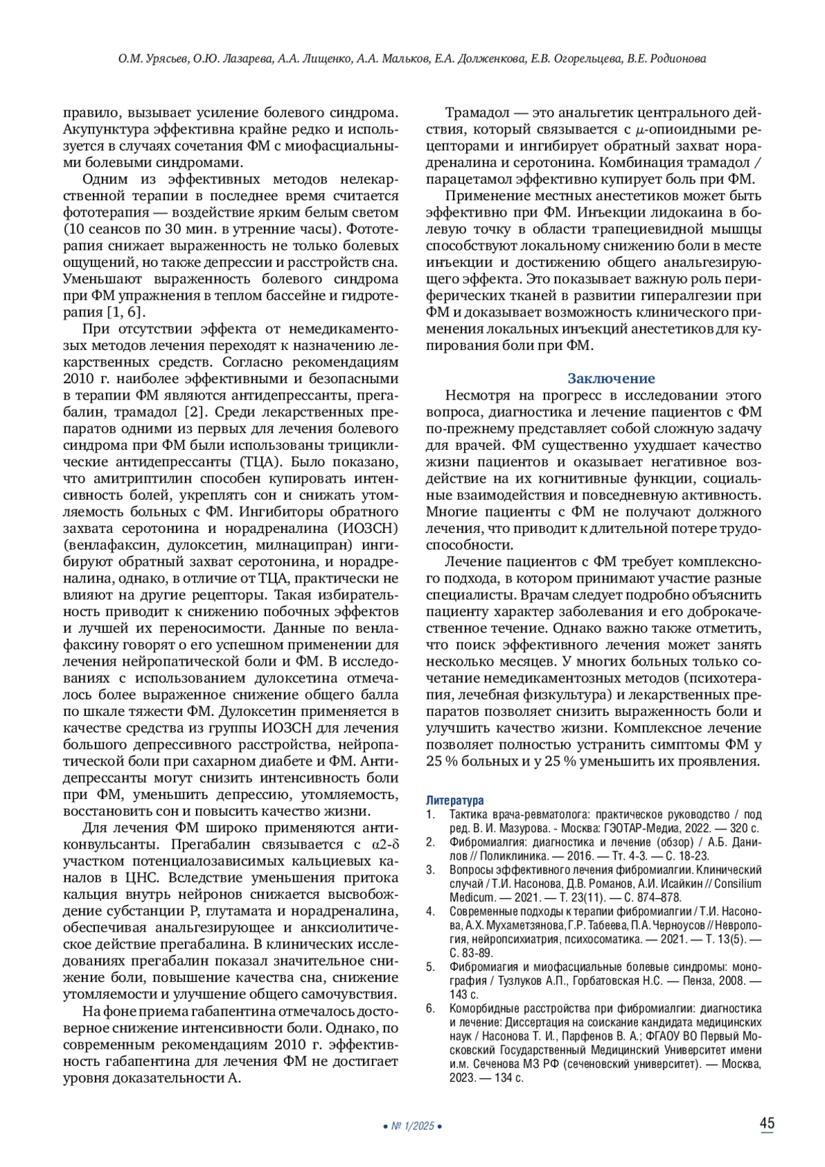 УРЯСЬЕВ О. М., ЛАЗАРЕВА О.Ю., ЛИЩЕНКО А.А., МАЛЬКОВ А. А., ДОЛЖЕНКОВА Е., ОГОРЕЛЬЦЕВА Е.В., РОДИОНОВА В.Е. ОСОБЕННОСТИ ВЕДЕНИЯ ПАЦИЕНТОВ С ФИБРОМИАЛГИЕЙ В КЛИНИЧЕСКОЙ ПРАКТИКЕ // СОВРЕМЕННАЯ ТЕРАПИЯ В ПСИХИАТРИИ И НЕВРОЛОГИИ. 2025. № 1
