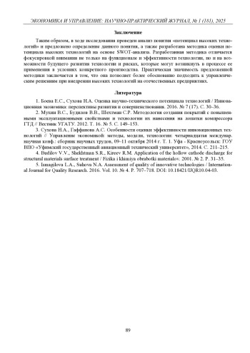 СУХОВА Н. А., ГАФФАНОВА А. С. ИСПОЛЬЗОВАНИЕ SWOT-АНАЛИЗА ДЛЯ ОЦЕНКИ ПОТЕНЦИАЛА ВЫСОКИХ ТЕХНОЛОГИЙ // ЭКОНОМИКА И УПРАВЛЕНИЕ: НАУЧНО-ПРАКТИЧЕСКИЙ ЖУРНАЛ. 2025. № 1 (181)