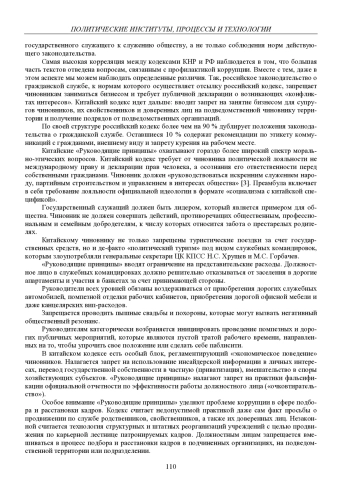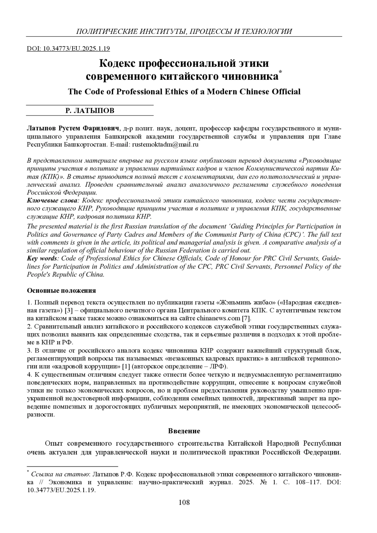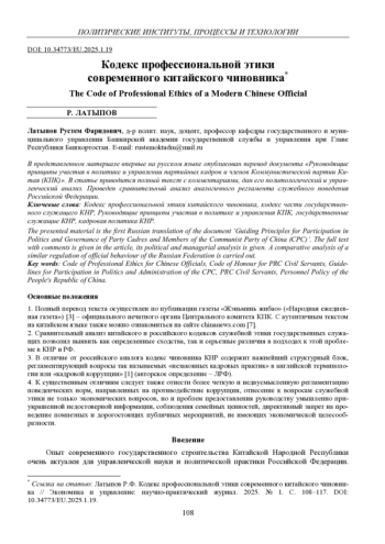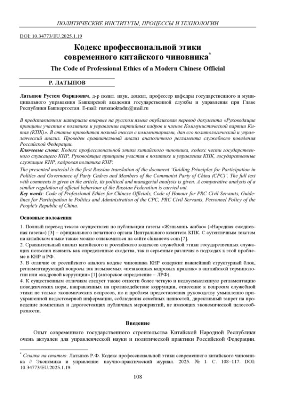 В представленном материале впервые на русском языке опубликован перевод документа «Руководящие принципы участия в политике и управлении партийных кадров и членов Коммунистической партии Китая (КПК)». В статье приводится полный текст с комментариями, дан его политологический и управленческий анализ. Проведен сравнительный анализ аналогичного регламента служебного поведения Российской Федерации.