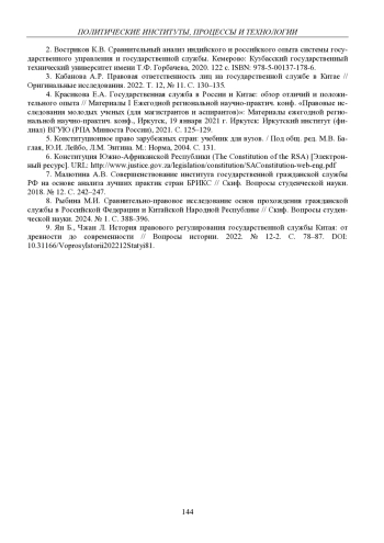 2. Востриков К.В. Сравнительный анализ индийского и российского опыта системы государственного управления и государственной службы. Кемерово: Кузбасский государственный технический университет имени Т.Ф. Горбачева, 2020. 122 с. ISBN: 978-5-00137-178-6 EDN: IBEFKE