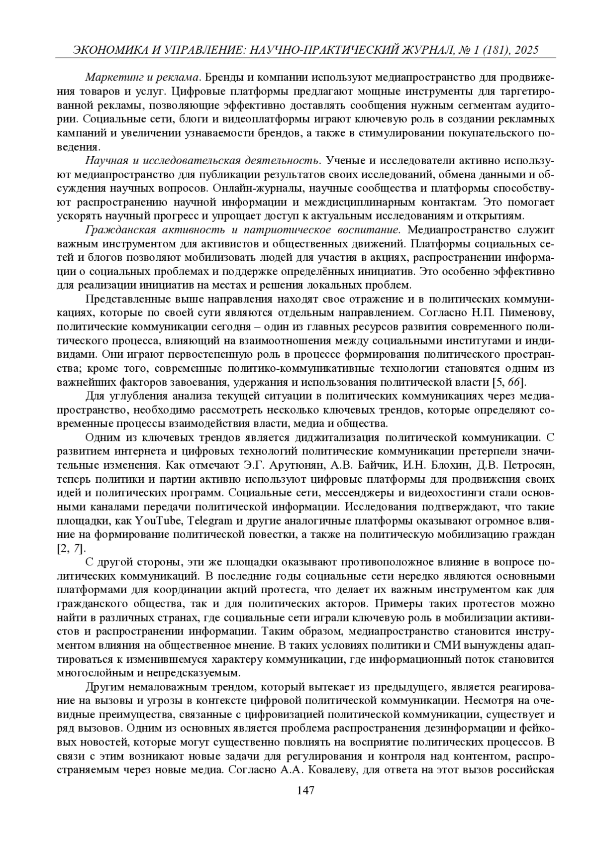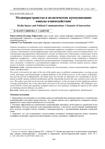 ФАРХУТДИНОВА И. Р., САБИТОВ Г. Р. МЕДИАПРОСТРАНСТВА И ПОЛИТИЧЕСКИЕ КОММУНИКАЦИИ: КАНАЛЫ ВЗАИМОДЕЙСТВИЯ // ЭКОНОМИКА И УПРАВЛЕНИЕ: НАУЧНО-ПРАКТИЧЕСКИЙ ЖУРНАЛ. 2025. № 1 (181)