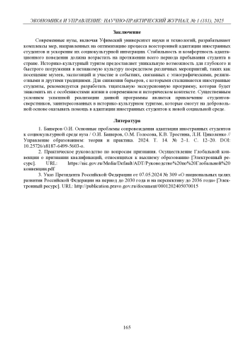 ВАГАПОВ Р. Р., ВАН Ц. УПРАВЛЕНИЕ СОЦИОКУЛЬТУРНОЙ АДАПТАЦИЕЙ ИНОСТРАННЫХ СТУДЕНТОВ: ОПЫТ УФИМСКОГО УНИВЕРСИТЕТА НАУКИ И ТЕХНОЛОГИЙ // ЭКОНОМИКА И УПРАВЛЕНИЕ: НАУЧНО-ПРАКТИЧЕСКИЙ ЖУРНАЛ. 2025. № 1 (181)