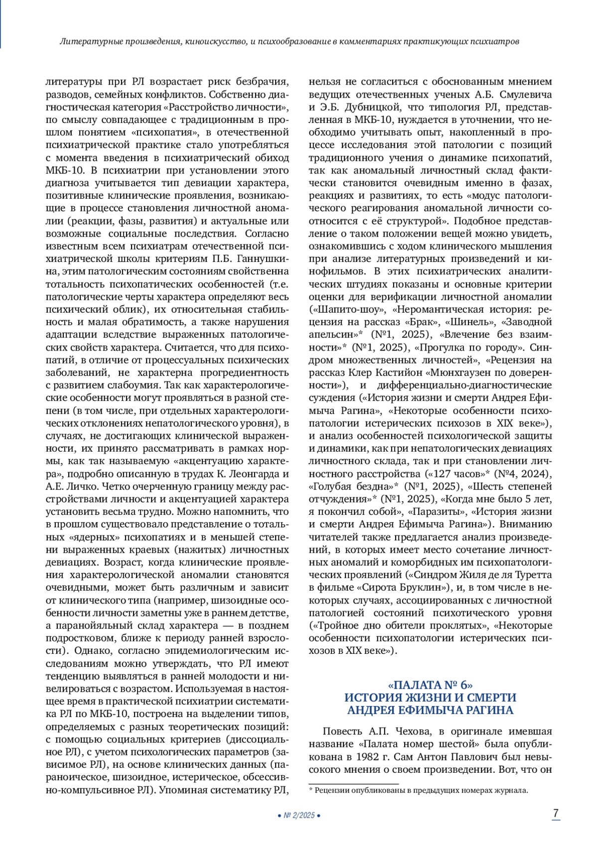 Одним из замыслов нашей образовательной работы являлась попытка показать, как некоторые клинические категории и понятия могут быть воплощены в литературных произведениях и киноискусстве, как искусство, работающее прежде всего с человеческими чувствами, переживаниями, эмоциями, воссоздает иногда с удивительной правдивостью особенности психопатологии. Другим стремлением было желание представить читателям нашего журнала собственно движение клинического мышления практикующего психиатра на примере анализа фильмов или литературных трудов, в которых герои страдают психическим расстройством. В частности, мы стремились продемонстрировать ту линию размышления, ту направленность интеллектуальной реакции, которая возникает в процессе формирования определенного диагностического суждения при оценке психопатологического феномена.