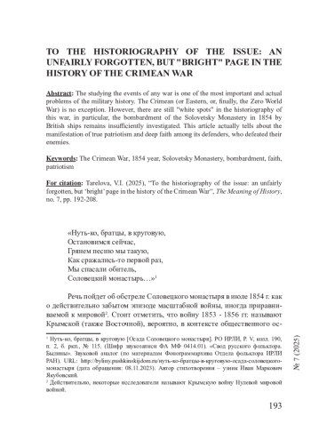 Изучение событий любой войны – одна из важнейших и актуальных проблем военной истории. Крымская (или Восточная, или, наконец, Нулевая мировая война) – не исключение. Однако в историографии этой войны до сих пор присутствуют «белые пятна», в частности, недостаточно исследованным остается обстрел Соловецкого монастыря в 1854 г. англичанами. О проявлении истинного патриотизма и глубокой веры у его защитников, одержавших победу над врагами, собственно, и повествует настоящая статья.