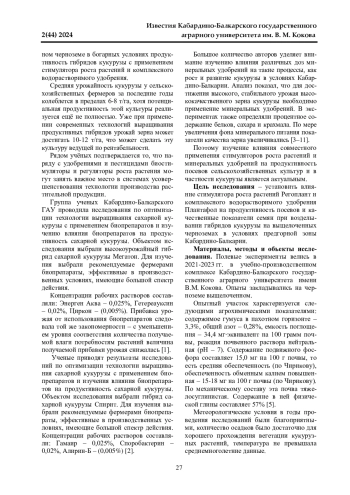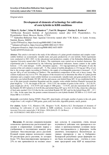 Данная статья посвящена изучению влияния стимулятора роста растений и комплексного водорастворимого удобрения на хозяйственно-ценные признаки и зерновую продуктивность гибридов кукурузы. Полевые эксперименты проводились в 2021-2023 гг. в учебно-производственном комплексе Кабардино-Балкарского государственного аграрного университета имени В. М. Кокова. Опыты закладывались на черноземе выщелоченном. Опытный участок характеризуется следующими агрохимическими показателями: содержимое гумуса в пахотном горизонте - 3,3%, общий азот - 0,28%, емкость поглощения - 34,4 мг∙эквивалент на 100 грамм почвы, реакция почвенного раствора нейтральная (рН - 7). Содержание подвижного фосфора составляет 15,0 мг на 100 г почвы, то есть средняя обеспеченность (по Чирикову), обеспеченность обменным калием повышенная - 15-18 мг на 100 г почвы (по Чирикову). По механическому составу эта почва тяжелосуглинистая. Содержание в ней физической глины составляет 57%. Целью исследований было определение влияния стимулятора роста растений и комплексного водорастворимого удобрения на хозяйственно-ценные признаки и зерновую продуктивность среднераннего гибрида кукурузы Родник 292 МВ и среднеспелого гибрида кукурузы Диана МВ. Установлено, что применение стимулятора роста растений Регоплант и комплексного водорастворимого удобрения Плантафол увеличили высоту растения на 3,7%, длину початка на 10,6-13,5%, количество зѐрен в початке на 24,2-26,3%, массу зерна с одного початка на 15,8-35,9% и массу 1000 зѐрен на 7,5-9,4%, а также максимально увеличило урожайность у гибрида Родник 292 МВ до 8,16-8,96 т/га и гибрида Диана МВ до 10,0-10,32 т/га, где сбор кормовых единиц достигал 12,6-13,8 т/га для гибрида кукурузы Родник 292 МВ и у гибрида Диана МВ - 15,7-16,1 т/га. При этом содержание белка выросло у гибридов кукурузы Родник 292 МВ до 13,2-18,4% и Диана МВ до 11,8-29,4%.