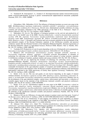1. Гуляжинов И. Х., Шибзухов З. Г. С. Влияние биопрепаратов на посевы сахарной кукурузы в условиях КБР // Международная научная конференция молодых учѐных и специалистов, посвящѐнная 180-летию со дня рождения К.А. Тимирязева. Сборник статей. Москва, 2023. С. 212-216. EDN: TBIPXO