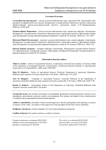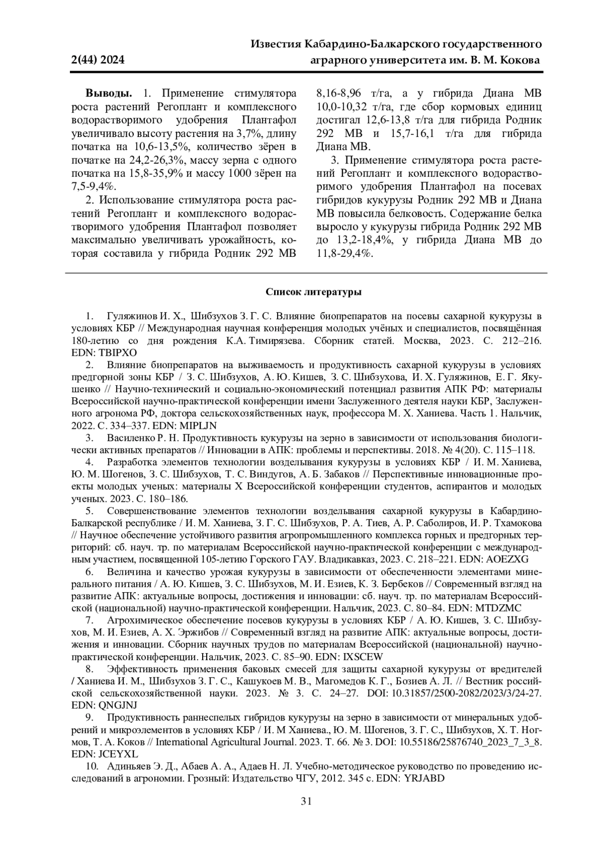 6. Величина и качество урожая кукурузы в зависимости от обеспеченности элементами минерального питания / А. Ю. Кишев, З. С. Шибзухов, М. И. Езиев, К. З. Бербеков // Современный взгляд на развитие АПК: актуальные вопросы, достижения и инновации: сб. науч. тр. по материалам Всероссийской (национальной) научно-практической конференции. Нальчик, 2023. С. 80-84. EDN: MTDZMC