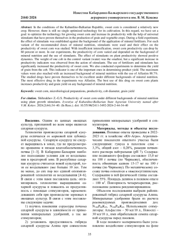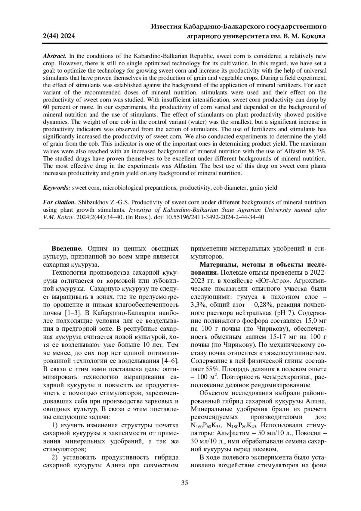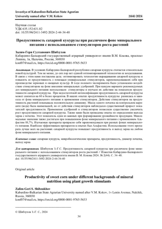 ШИБЗУХОВ З. С. ПРОДУКТИВНОСТЬ САХАРНОЙ КУКУРУЗЫ ПРИ РАЗЛИЧНОМ ФОНЕ МИНЕРАЛЬНОГО ПИТАНИЯ С ИСПОЛЬЗОВАНИЕМ СТИМУЛЯТОРОВ РОСТА РАСТЕНИЙ // ИЗВЕСТИЯ КАБАРДИНО-БАЛКАРСКОГО ГОСУДАРСТВЕННОГО АГРАРНОГО УНИВЕРСИТЕТА ИМ. В. М. КОКОВА. 2024. № 2 (44)