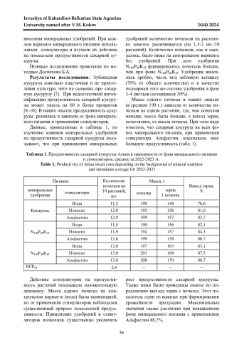 Статья: ПРОДУКТИВНОСТЬ САХАРНОЙ КУКУРУЗЫ ПРИ РАЗЛИЧНОМ ФОНЕ МИНЕРАЛЬНОГО ПИТАНИЯ С ИСПОЛЬЗОВАНИЕМ СТИМУЛЯТОРОВ РОСТА РАСТЕНИЙ (2024)