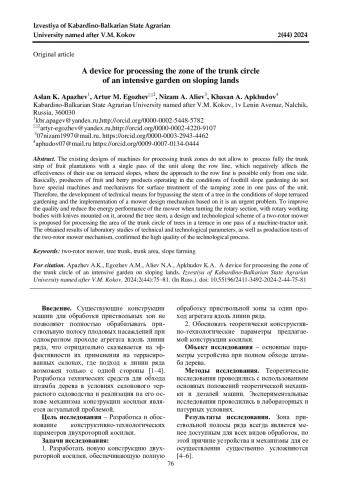 Существующие конструкции машин для обработки приствольных зон не позволяют полностью обрабатывать приствольную полосу плодовых насаждений при однократном проходе агрегата вдоль линии ряда, что отрицательно сказывается на эффективности их применения на террасированных склонах, где подход к линии ряда возможен только с одной стороны. В основном, производители плодово-ягодной продукции, осуществляющие свою деятельность в условиях предгорного склонового садоводства, не имеют специальных машин и механизмов для поверхностной обработки приштамбовой зоны в один проход агрегата. Следовательно, разработка технических средств для обхода штамба дерева в условиях склонового террасного садоводства и реализация на его основе механизма конструкции косилки является актуальной проблемой. Для повышения качественных показателей работы и снижения энергетических затрат работы устройства при проворачивании поворотной секции с установленными на ней роторными рабочими органами с ножами вокруг штамба дерева предлагается конструктивно-технологическая схема двухроторной косилки для обработки зоны приствольного круга деревьев в условиях террасы за один проход машинотракторного агрегата. Полученные результаты лабораторных исследований технических и технологических параметров, а также производственных испытаний механизма двухроторной косилки подтвердили высокое качество выполнения технологического процесса.
