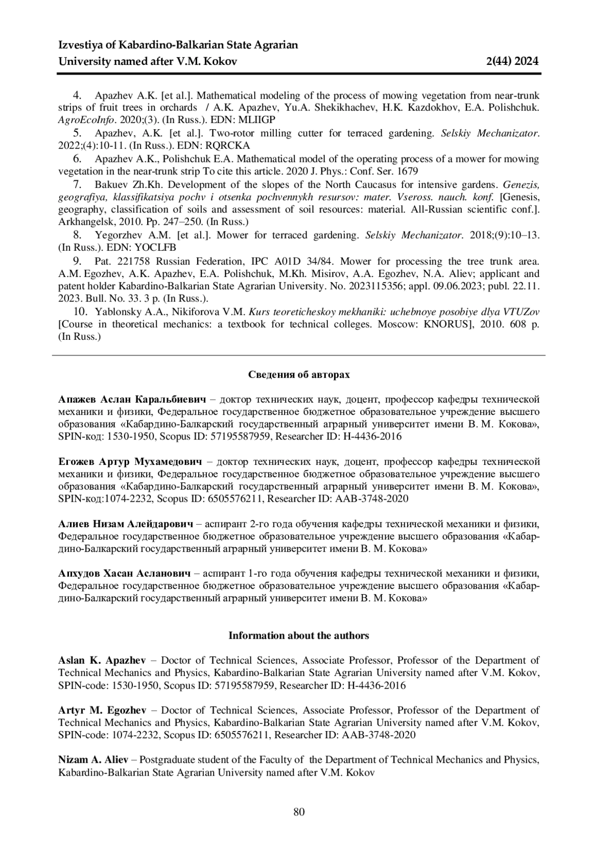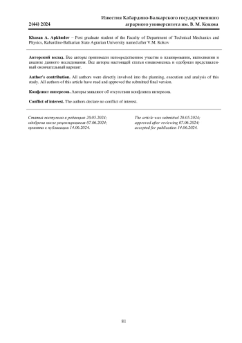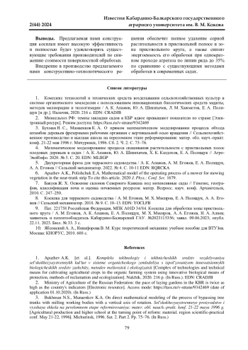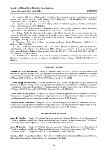 4. 	Математическое моделирование процесса скашивания растительности с приствольных полос плодовых деревьев в садах / А. К. Апажев, Ю. А. Шекихачев, Х. К. Каздохов, Е. А. Полищук // АгроЭкоИнфо. 2020. № 3. С. 20. EDN: MLIIGP