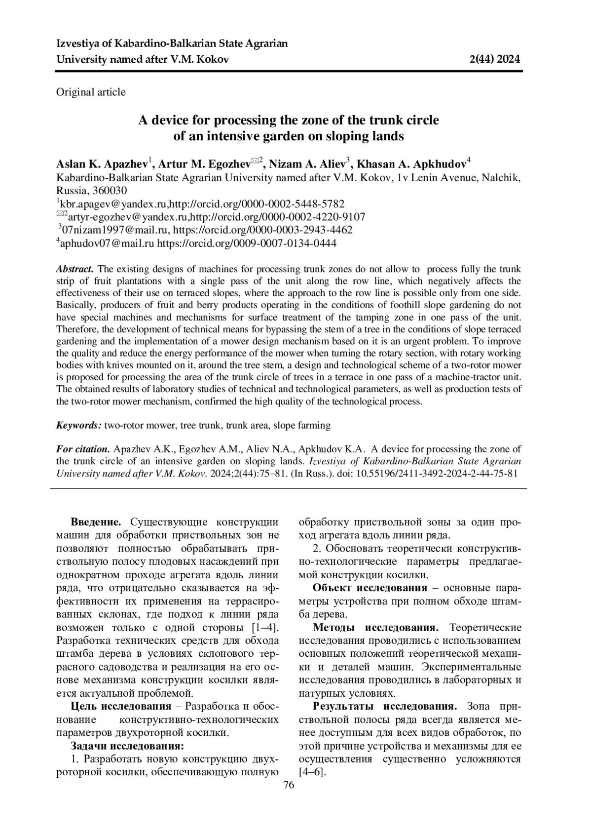 5. 	Двухроторная фреза для террасного садоводства / А. К. Апажев, А. М. Егожев, Е. А. Полищук, А. А. Егожев // Сельский механизатор. 2022. № 4. С. 10-11. EDN: RQRCKA