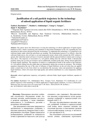 БАЙБУЛАТОВ Т. С., АБДУЛНАТИПОВ М. Г., ЮСУПОВ Ю. Г., БАЙБУЛАТОВ Т. Т. ОБОСНОВАНИЕ ТРАЕКТОРИИ ДВИЖЕНИЯ ЧАСТИЦЫ ПОЧВЫ ПРИ ТЕХНОЛОГИИ ВНУТРИПОЧВЕННОГО ВНЕСЕНИЯ ЖИДКИХ ОРГАНИЧЕСКИХ УДОБРЕНИЙ // ИЗВЕСТИЯ КАБАРДИНО-БАЛКАРСКОГО ГОСУДАРСТВЕННОГО АГРАРНОГО УНИВЕРСИТЕТА ИМ. В. М. КОКОВА. 2024. № 2 (44)