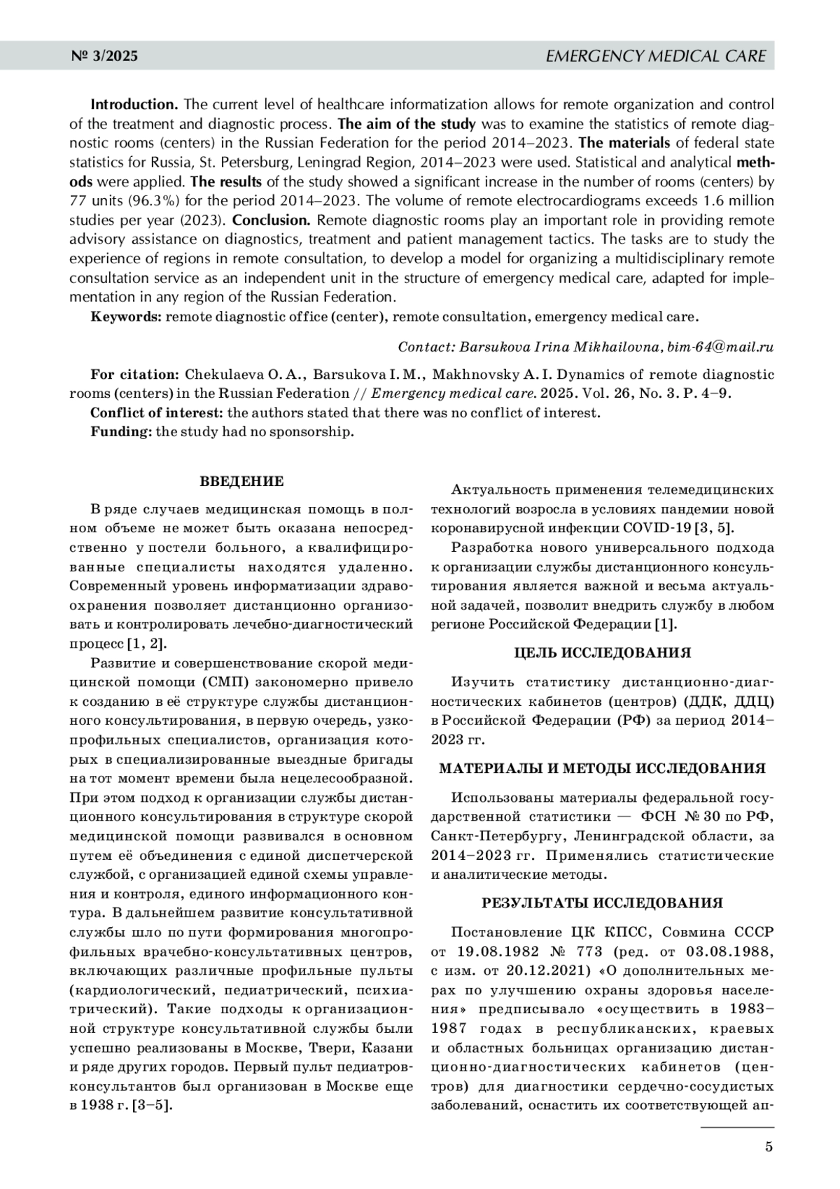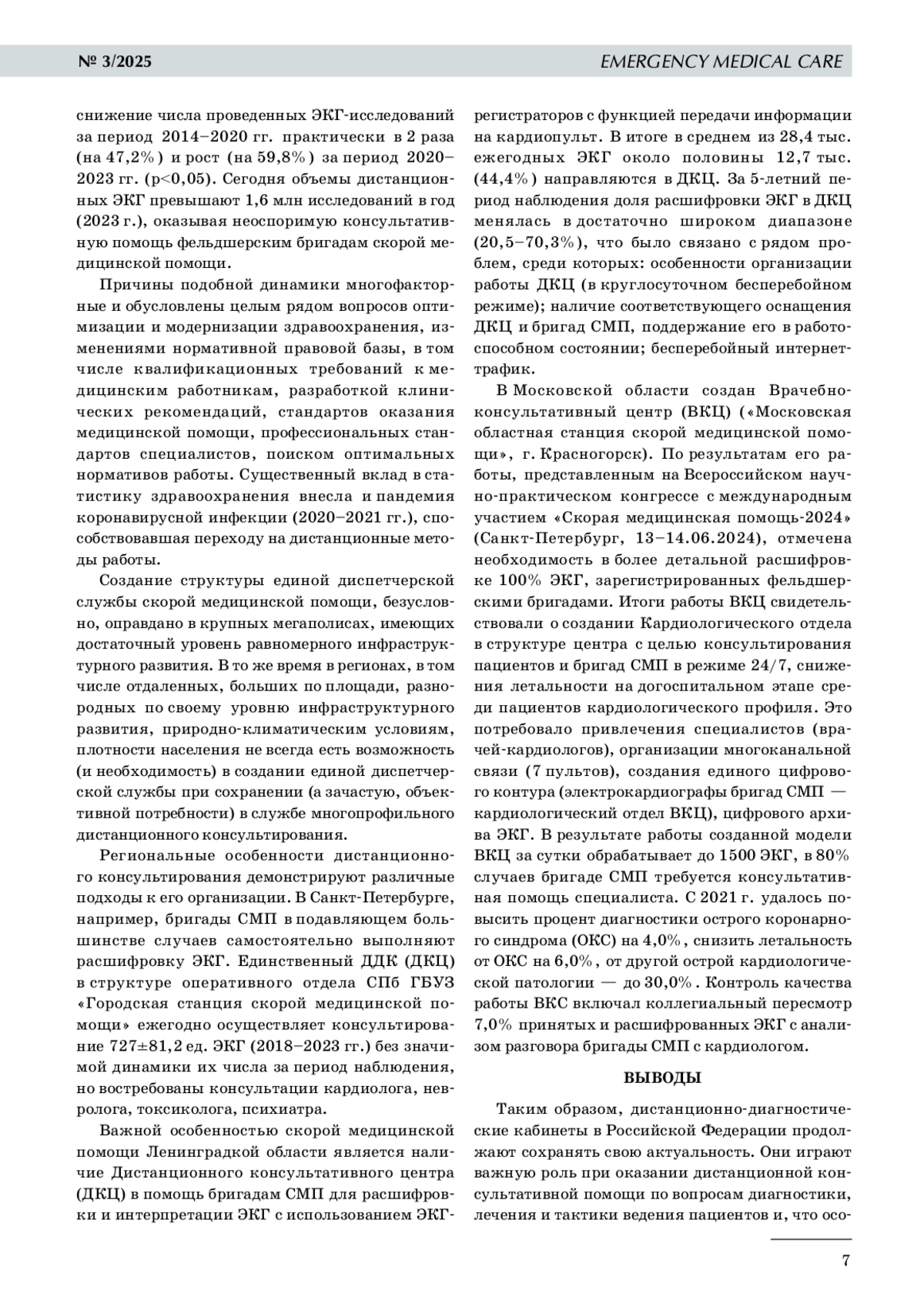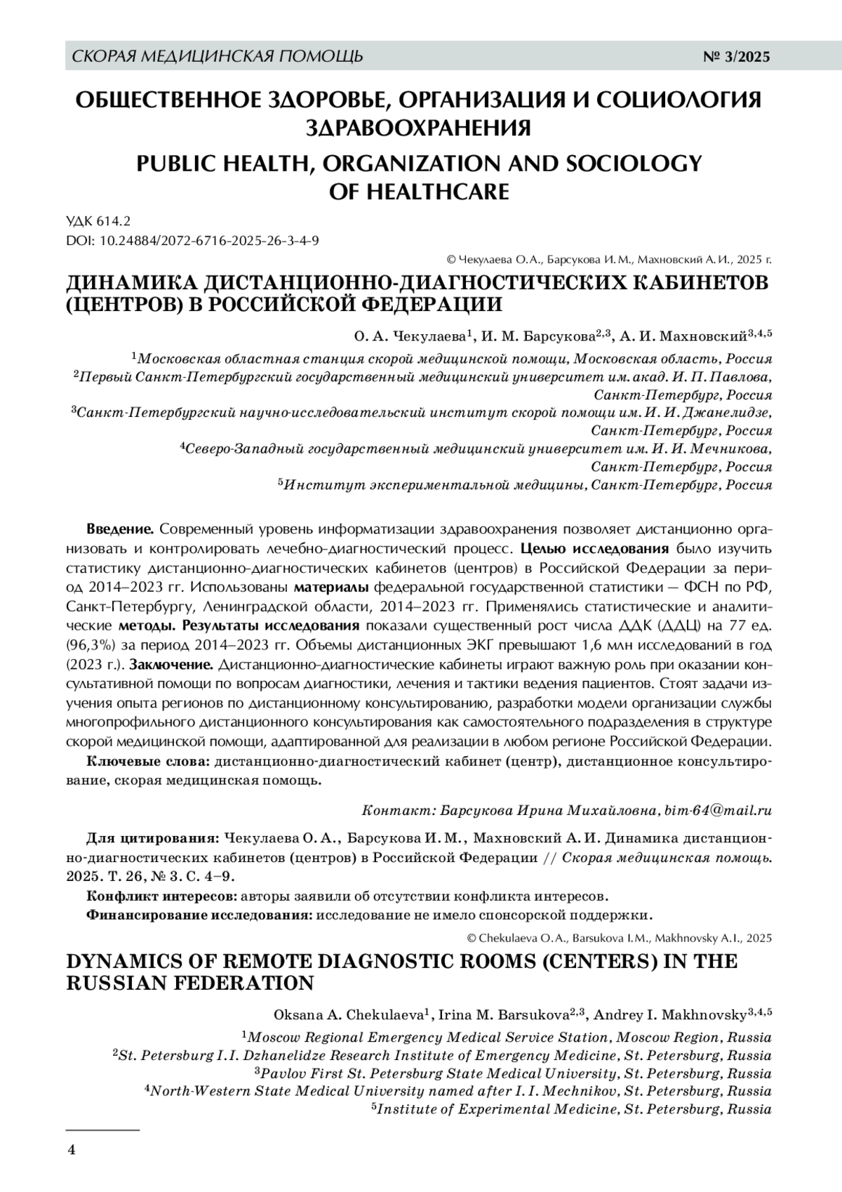 Современный уровень информатизации здравоохранения позволяет дистанционно организовать и контролировать лечебно- диагностический процесс. Целью исследования было изучить статистику дистанционно- диагностических кабинетов (центров) в Российской Федерации за период 2014–2023 гг. Использованы материалы федеральной государственной статистики — ФСН по РФ, Санкт- Петербургу, Ленинградской области, 2014–2023 гг. Применялись статистические и аналитические методы. Результаты исследования показали существенный рост числа ДДК (ДДЦ) на 77 ед. (96,3%) за период 2014–2023 гг. Объемы дистанционных ЭКГ превышают 1,6 млн исследований в год (2023 г.). Заключение. Дистанционно- диагностические кабинеты играют важную роль при оказании консультативной помощи по вопросам диагностики, лечения и тактики ведения пациентов. Стоят задачи изучения опыта регионов по дистанционному консультированию, разработки модели организации службы многопрофильного дистанционного консультирования как самостоятельного подразделения в структуре скорой медицинской помощи, адаптированной для реализации в любом регионе Российской Федерации.