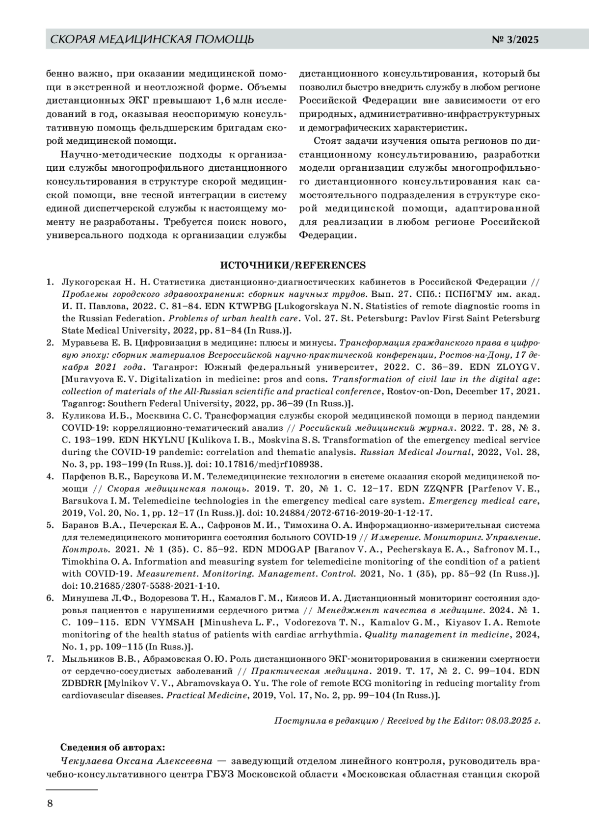 7. Мыльников В.В., Абрамовская О. Ю. Роль дистанционного ЭКГ-мониторирования в снижении смертности от сердечно- сосудистых заболеваний // Практическая медицина. 2019. Т. 17, № 2. С. 99–104. EDN ZDBDRR [Mylnikov V. V., Abramovskaya O. Yu. The role of remote ECG monitoring in reducing mortality from cardiovascular diseases. Practical Medicine, 2019, Vol. 17, No. 2, рр. 99–104 (In Russ.)].